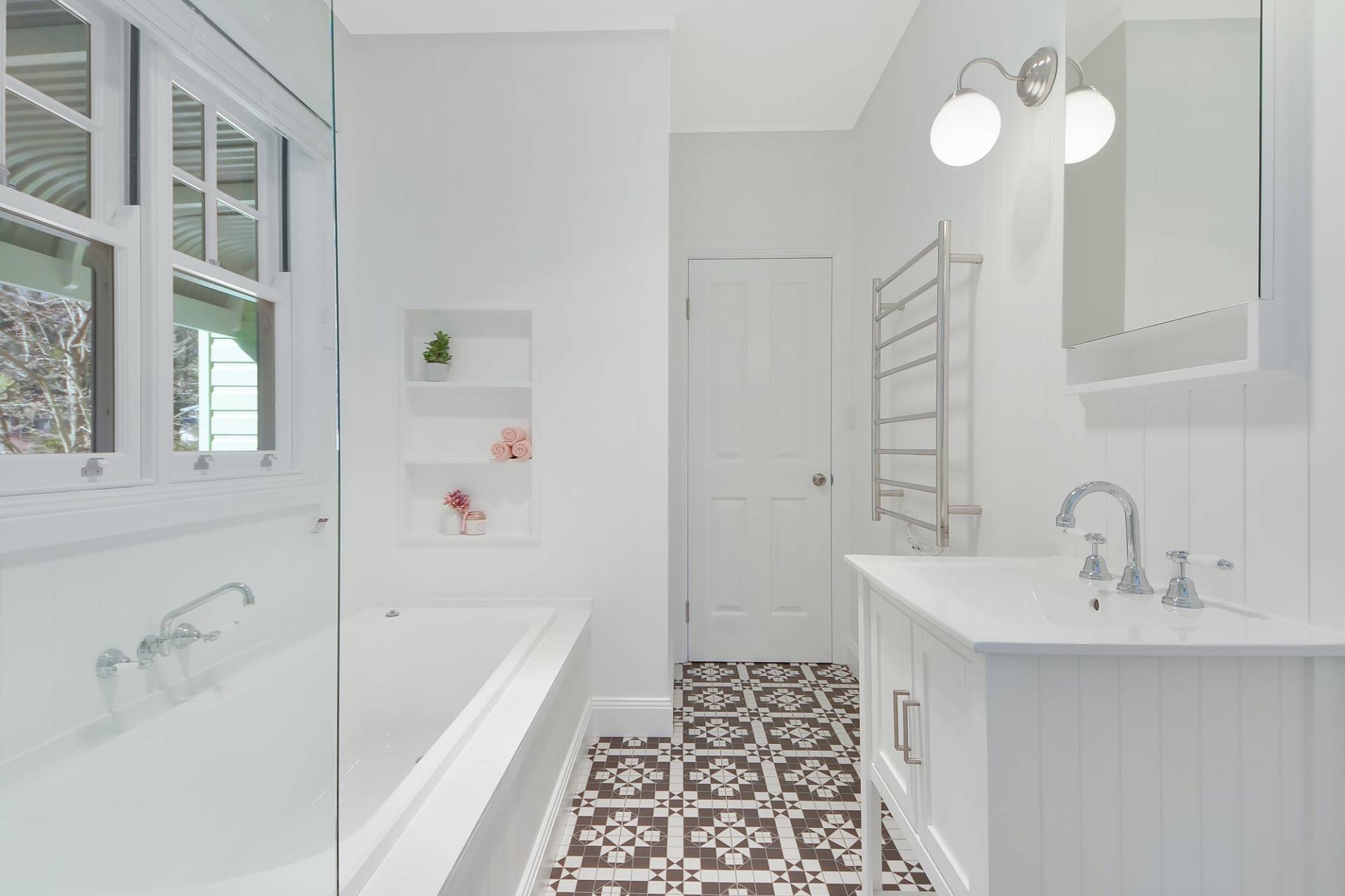 A beautifully appointed bathroom has separate bath and shower and heated towel rail for those chilly winter mornings.