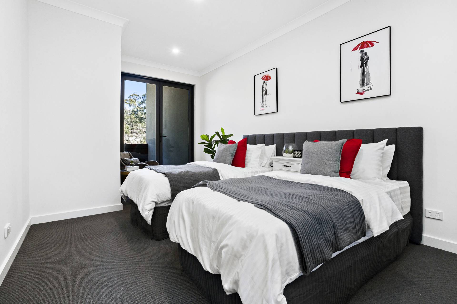- Bi-fold doors lead to a private courtyard overlooking 57 acres of parklands, ponds and walking tracks