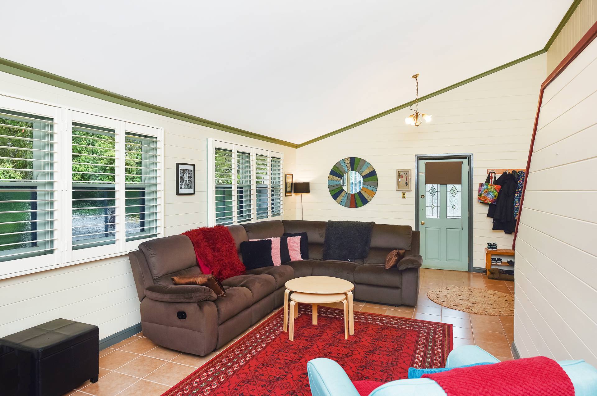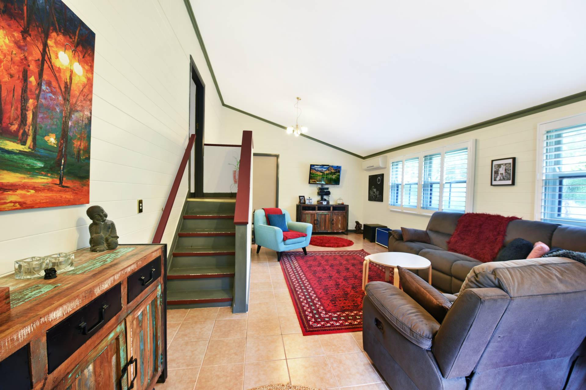 -          Large living area with tiled floors, reverse cycle air con, gas bayonet and plantation shutters