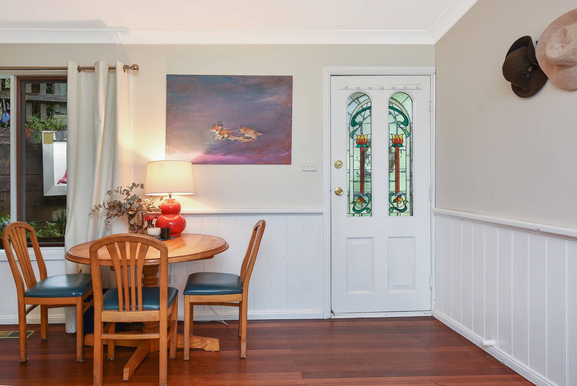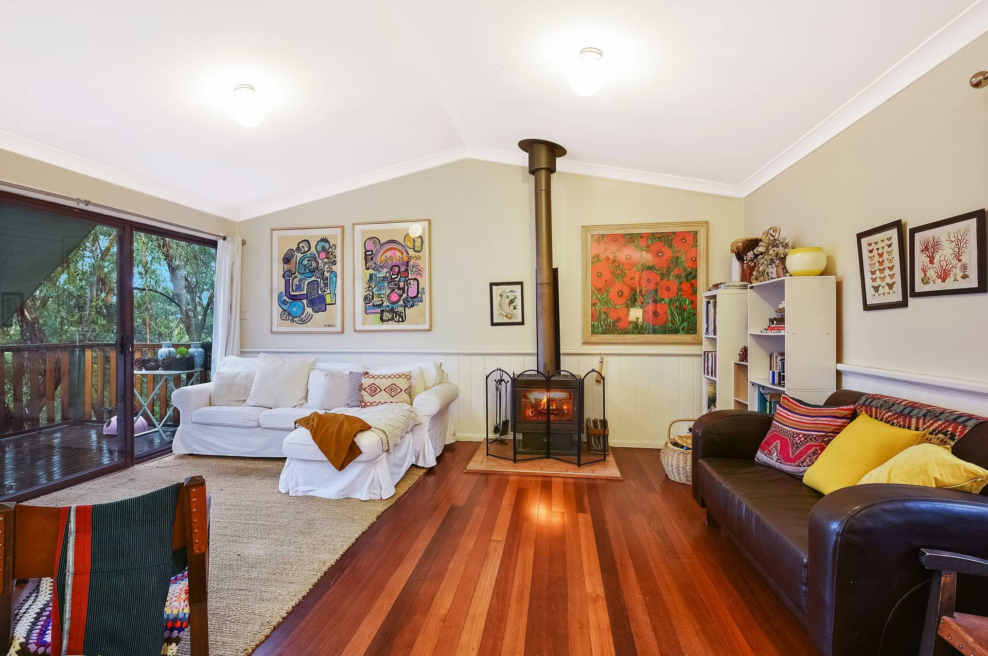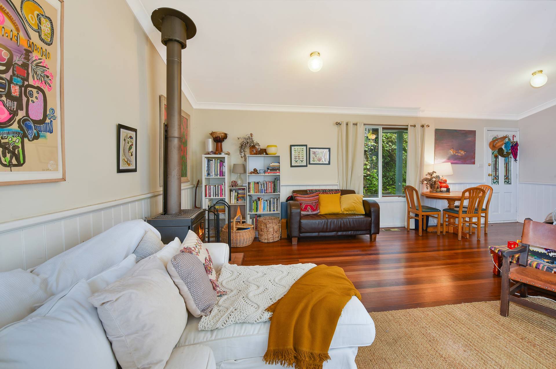 -          Open plan living/dining area with timber floors and cosy slow-combustion fire