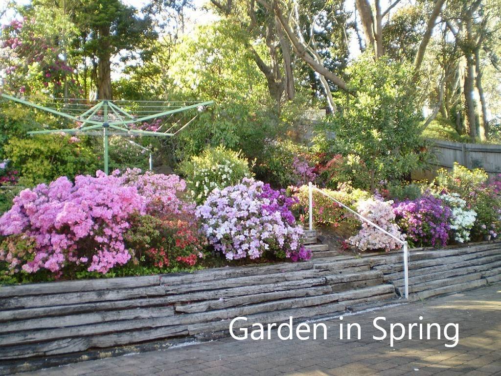 - Sunny paved yard with tiered garden beds full of bulbs which really come alive in Spring