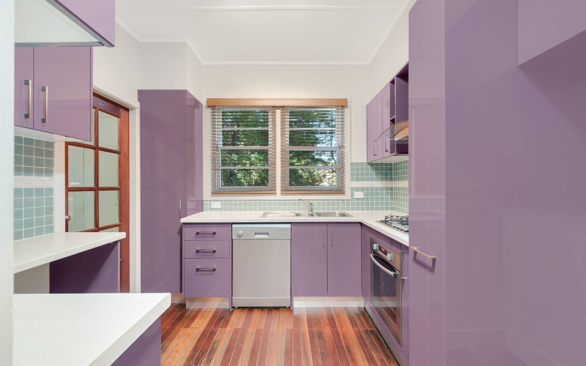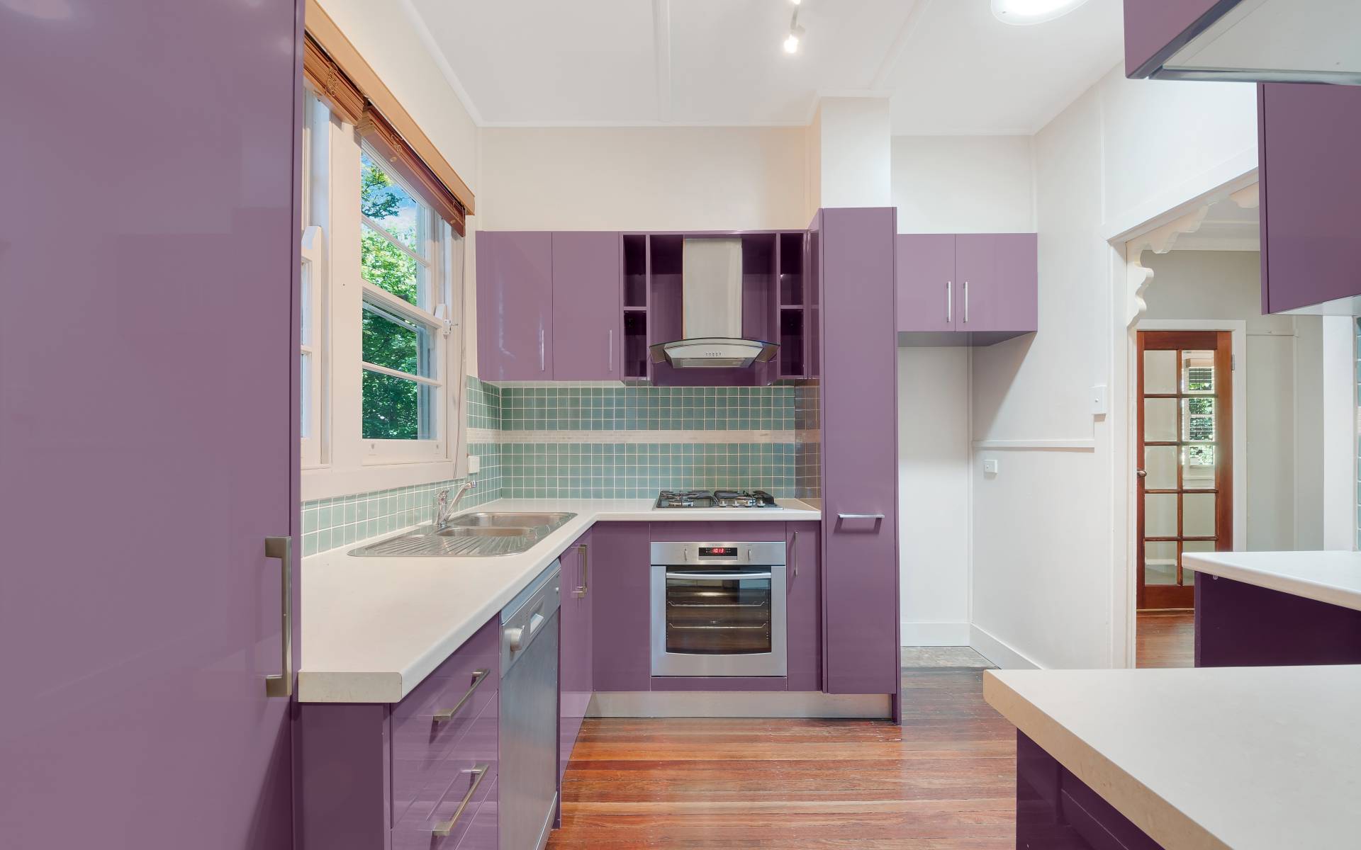 * Modern kitchen with stainless steel gas appliances and dishwasher