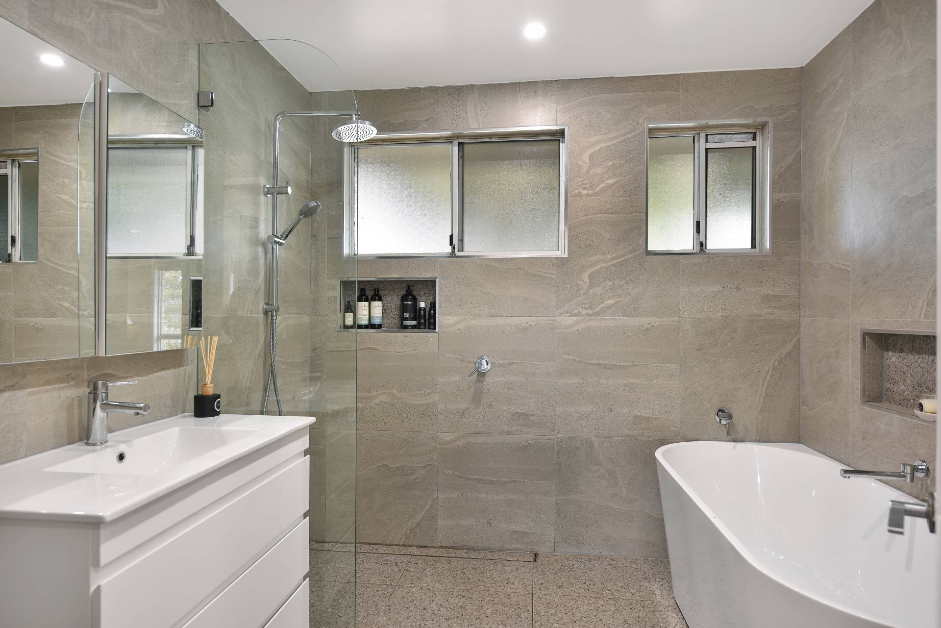 - Stunning bathroom with frameless glass shower and separate freestanding bath