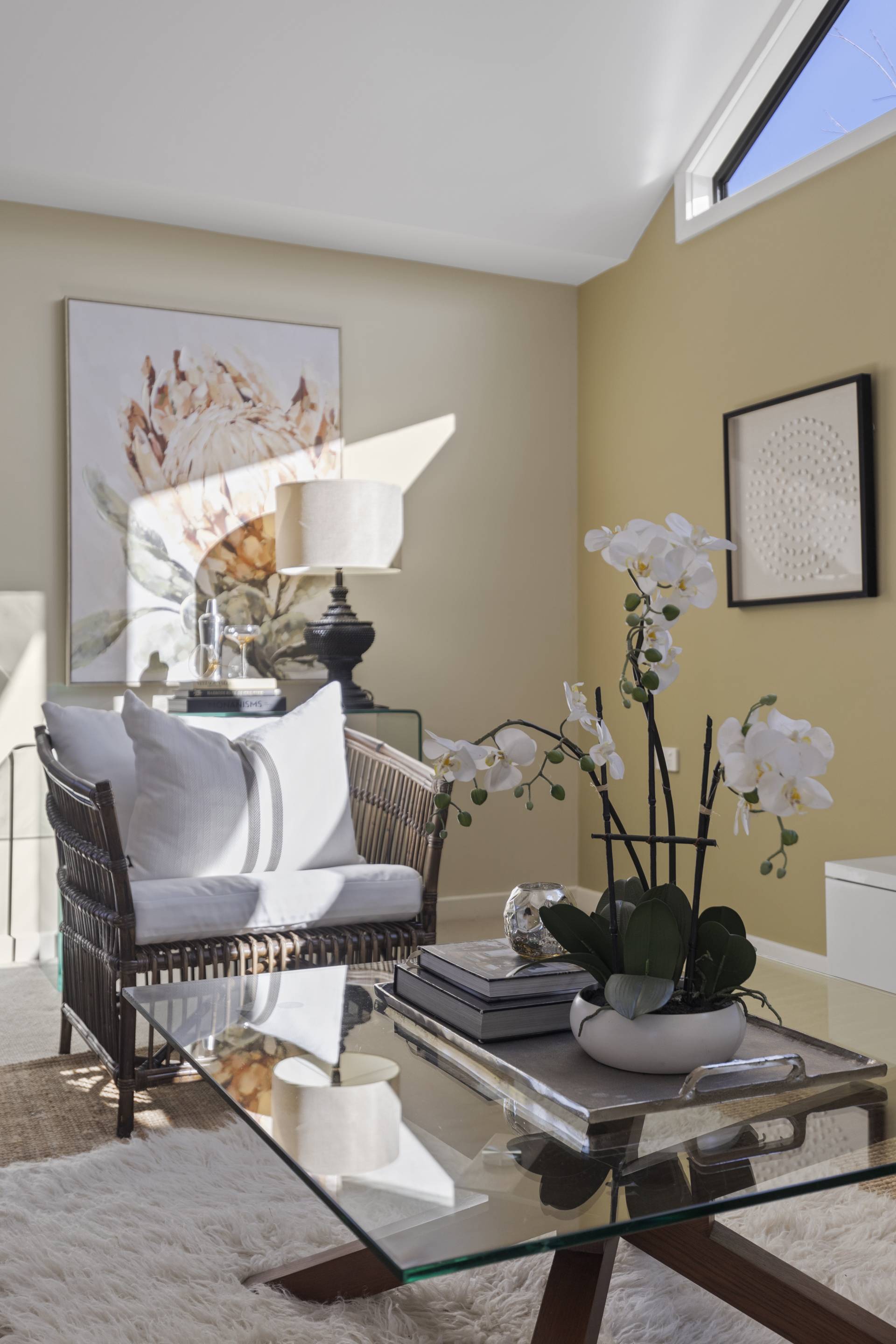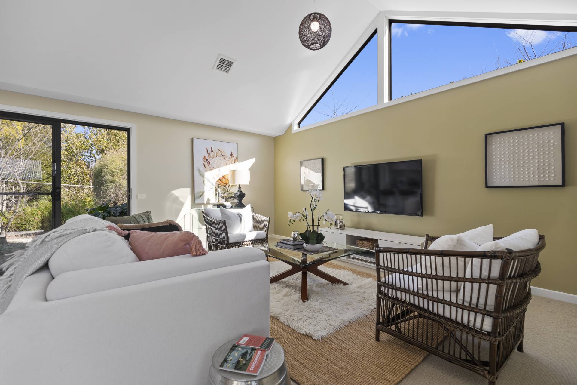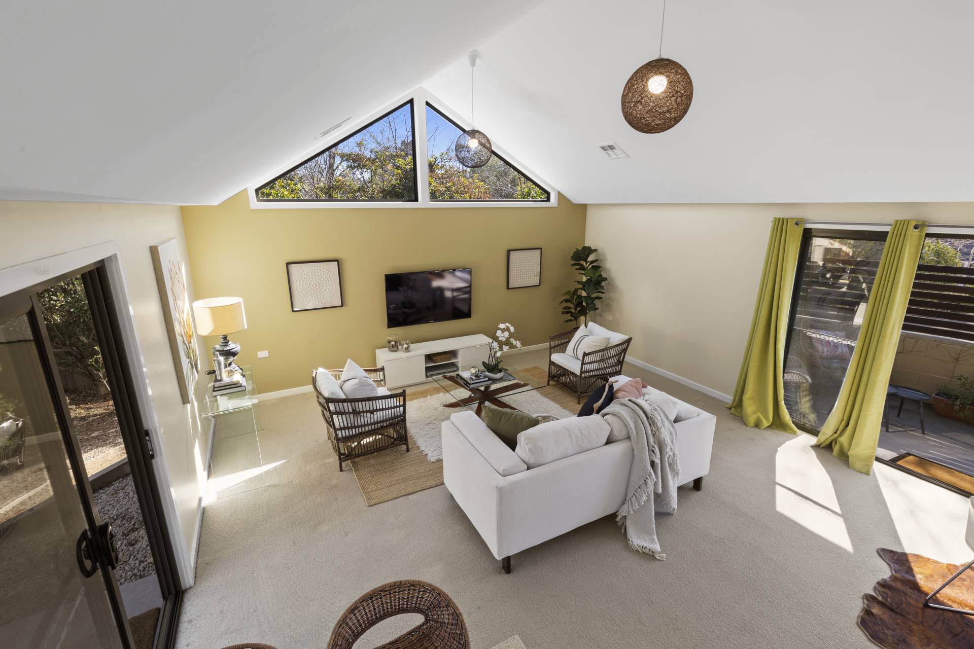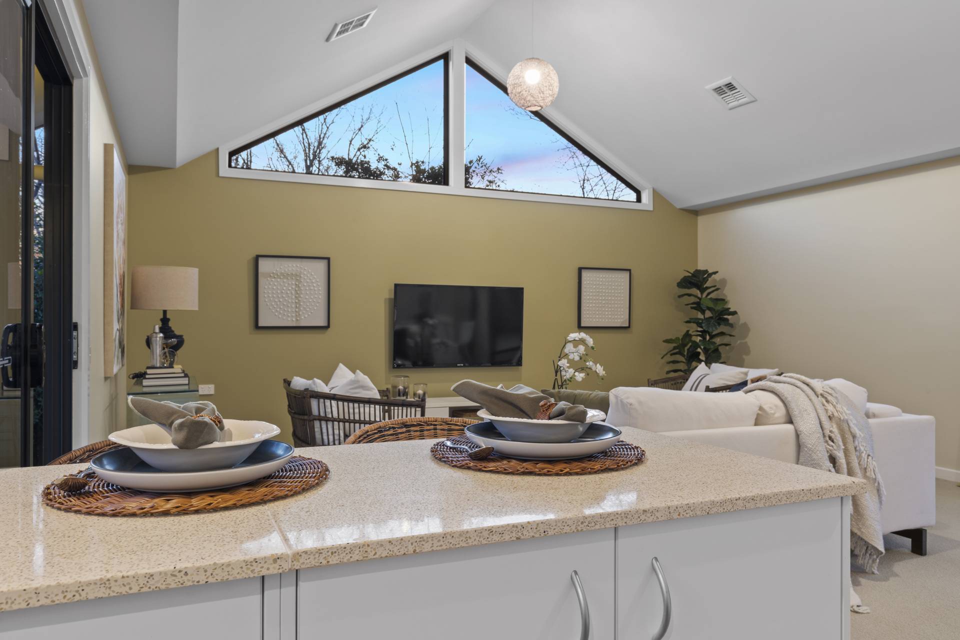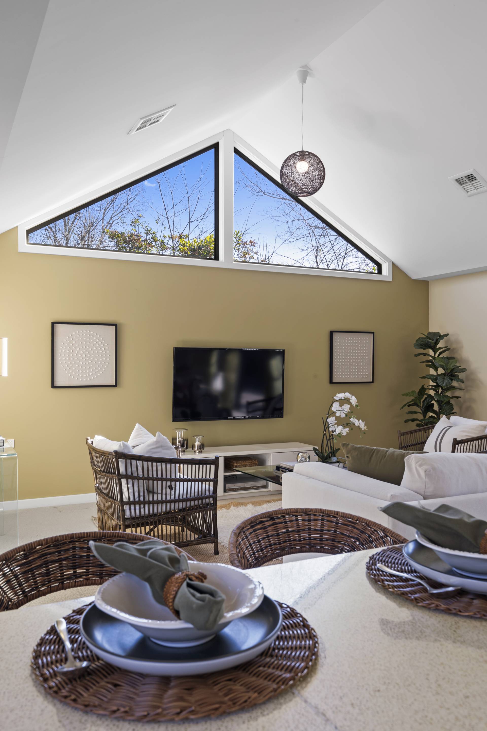 -    Open plan living/dining with high ceilings and striking feature windows