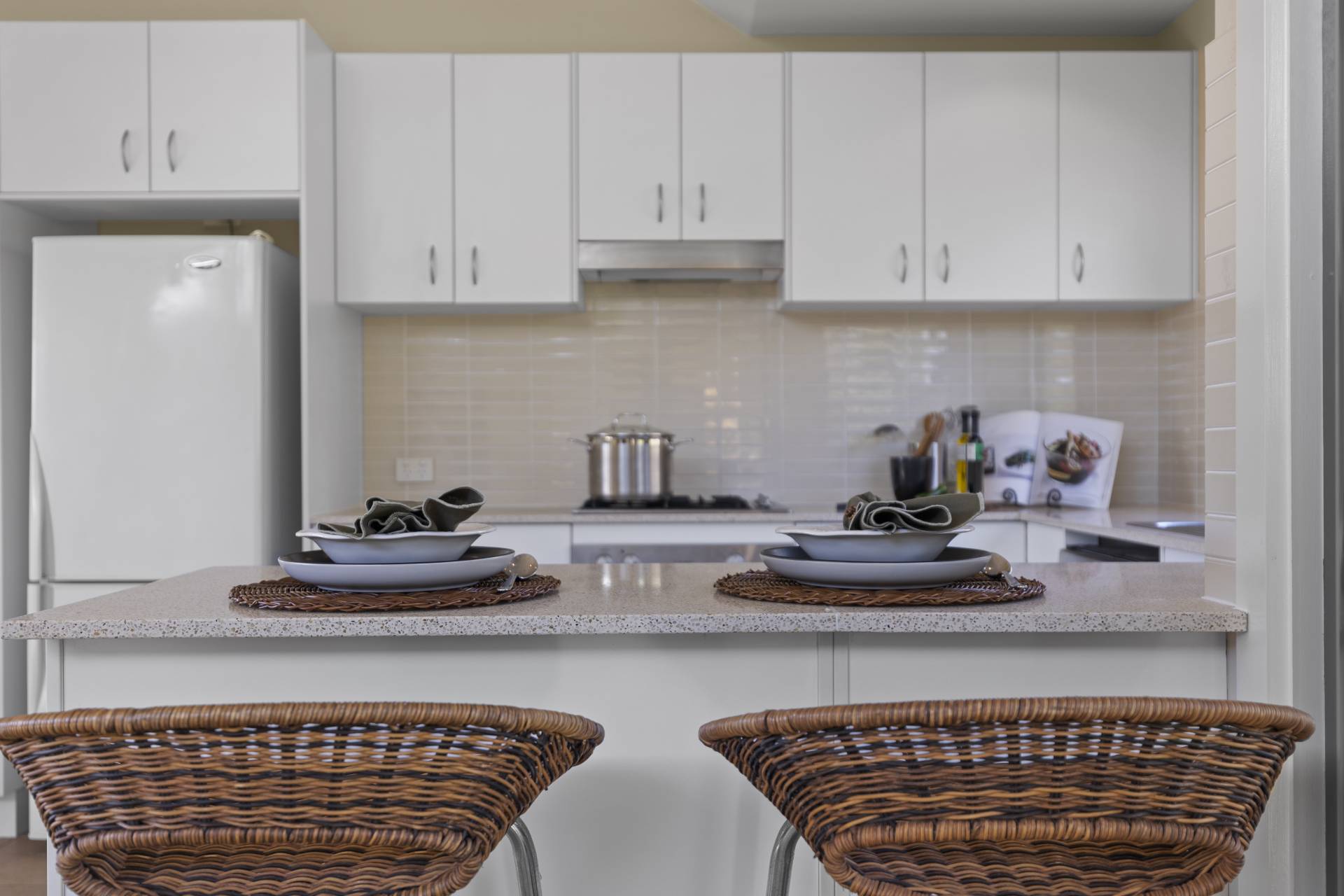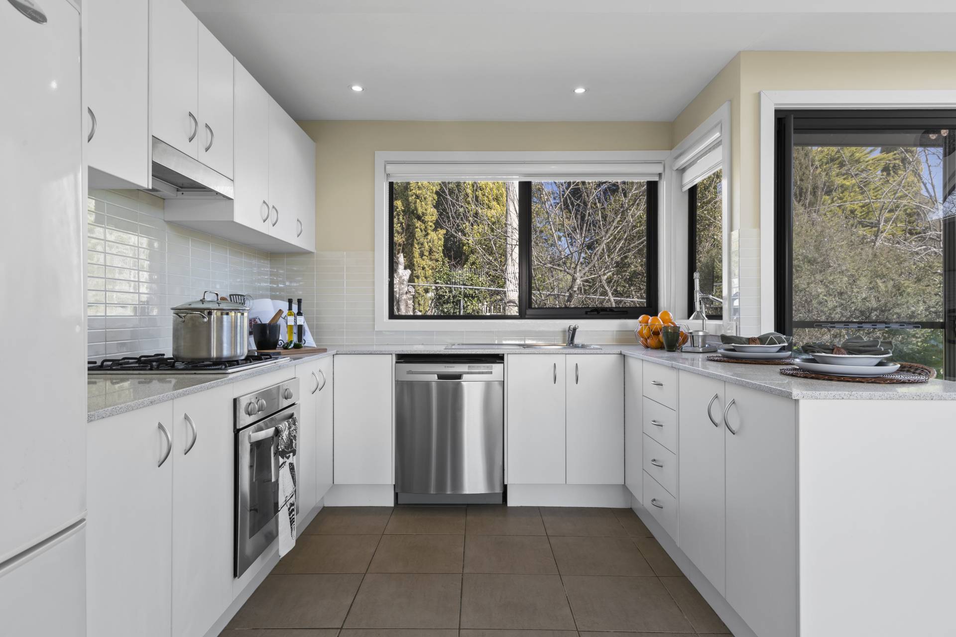 -    Large kitchen with stone benchtops, gas cooking and dishwasher