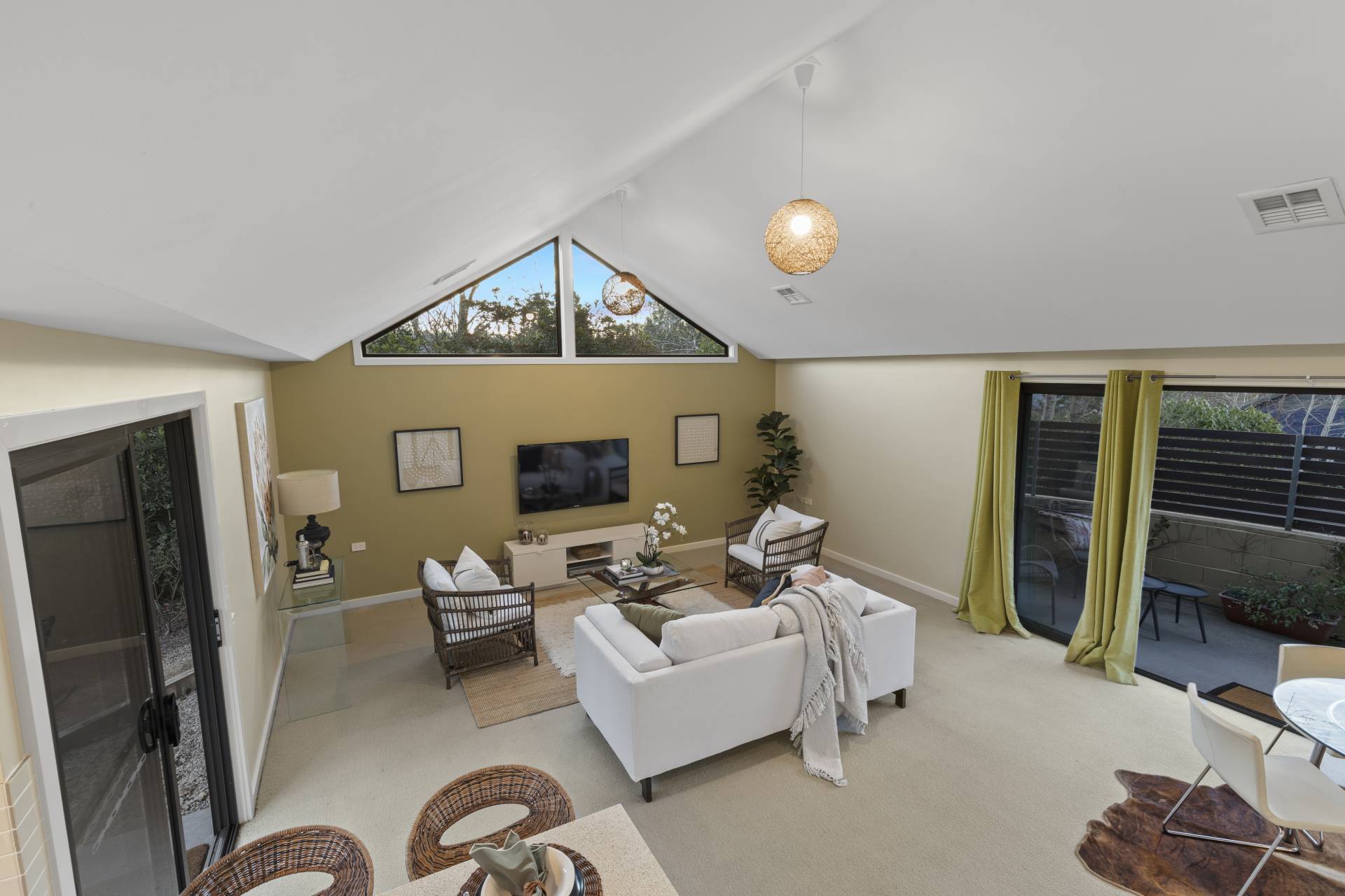 -    Open plan living/dining with high ceilings and striking feature windows
