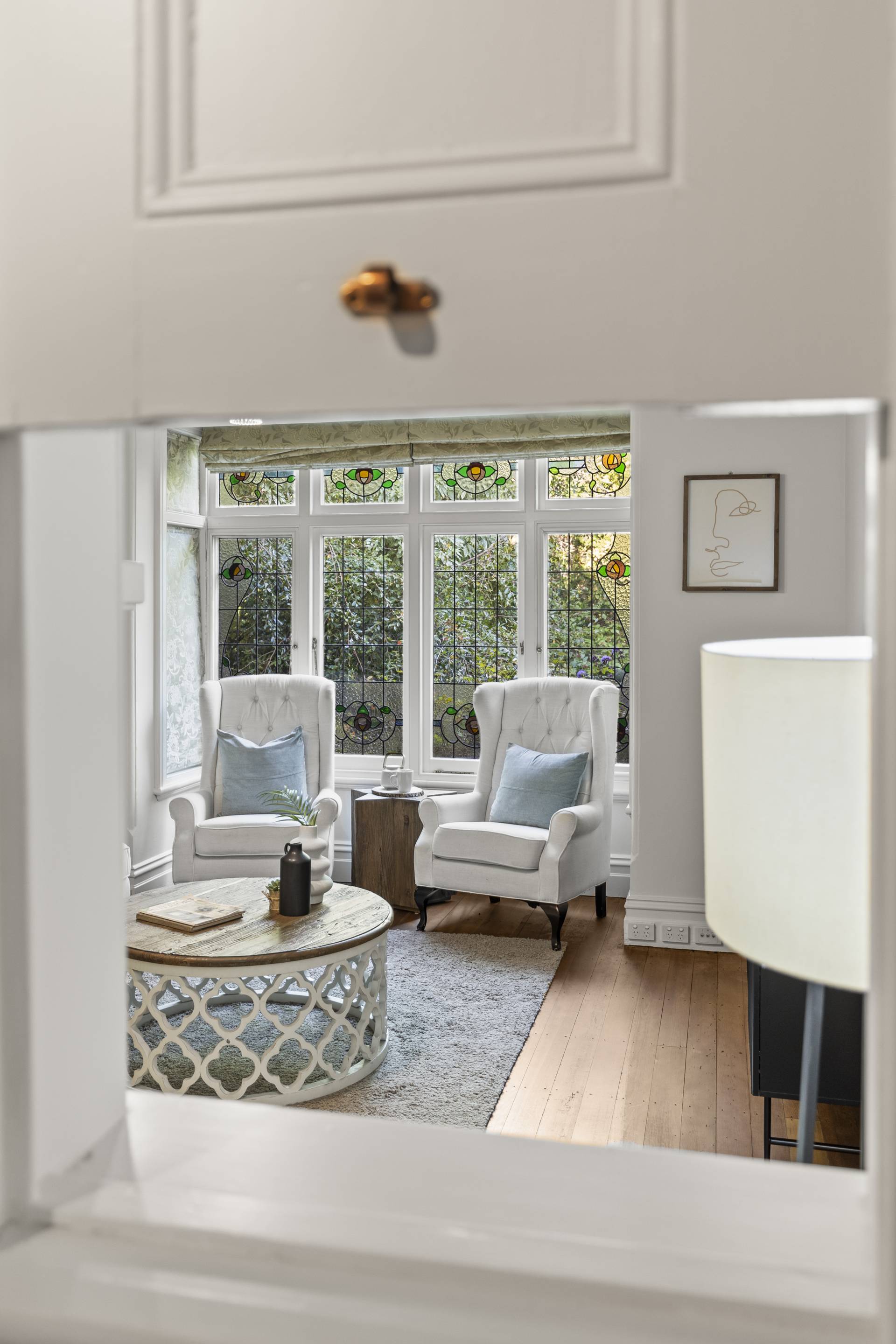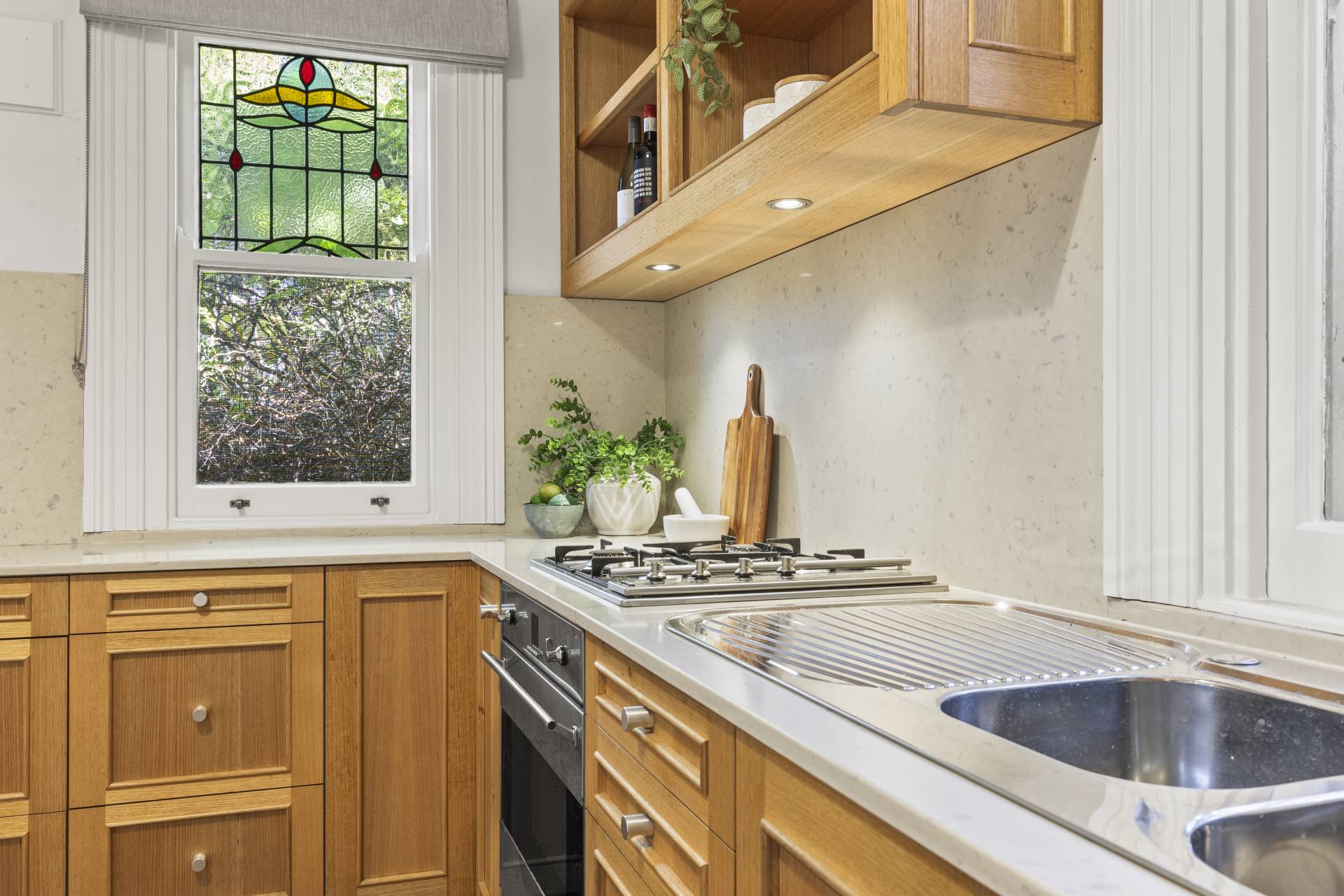 Just some of the period features include decorative stucco, original fireplaces in working order, stained glass windows, oversized French windows looking into the garden, ornate cornices, timber boarded raked soffits and timber flooring.