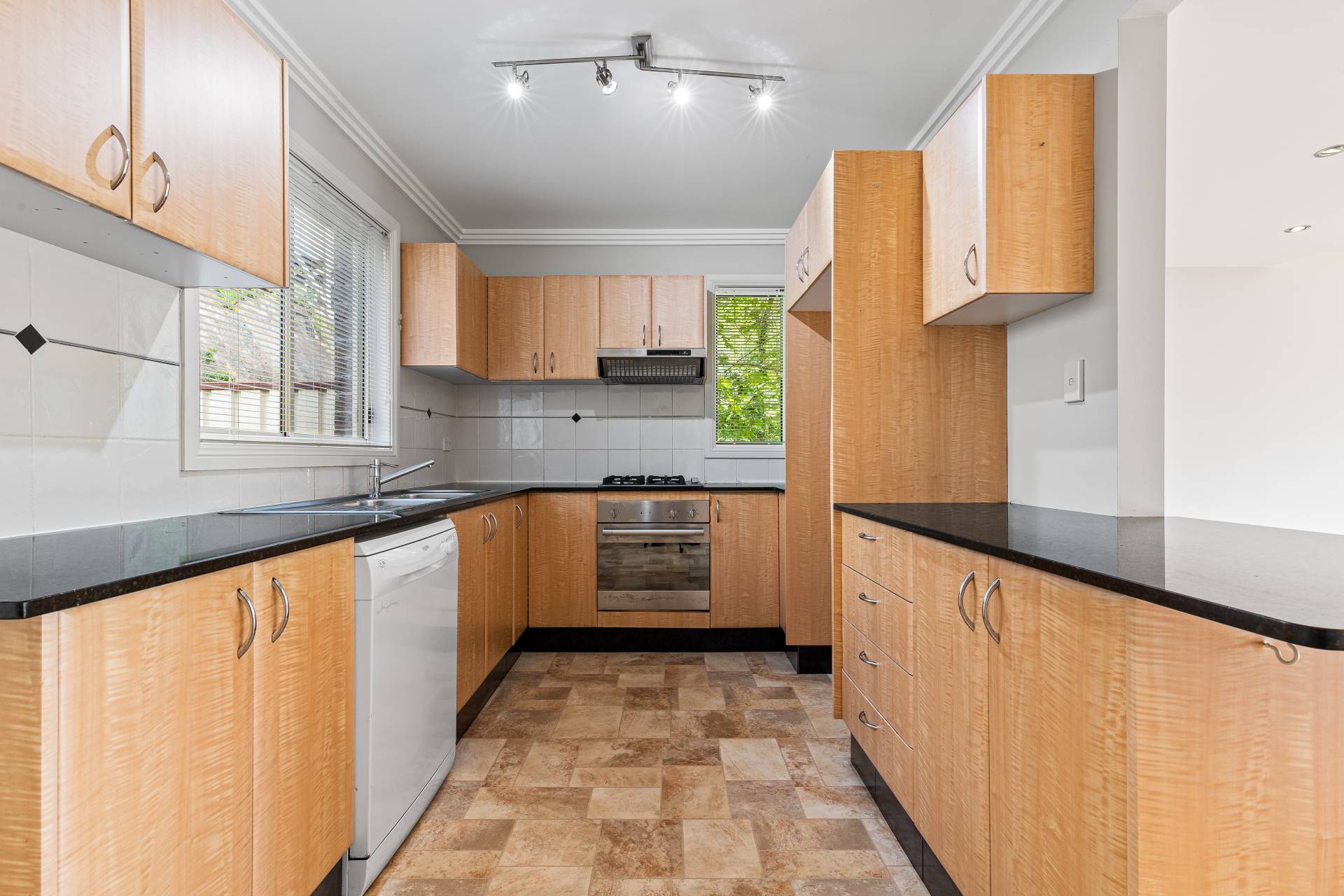 -    Large functional kitchen with stone benchtops, gas cooking and dishwasher
