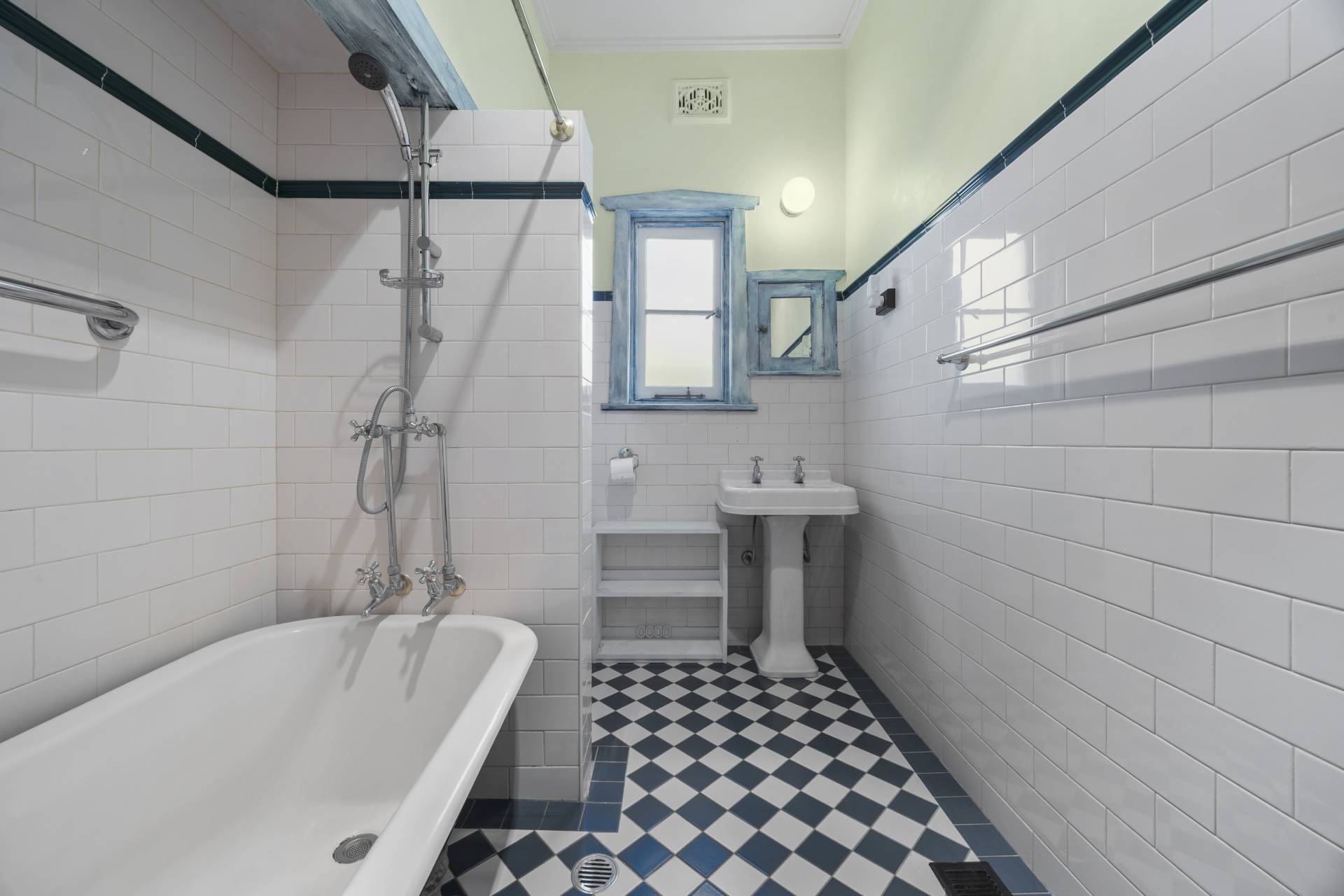 -    Period style bathroom with iron claw foot bath and pedestal sink