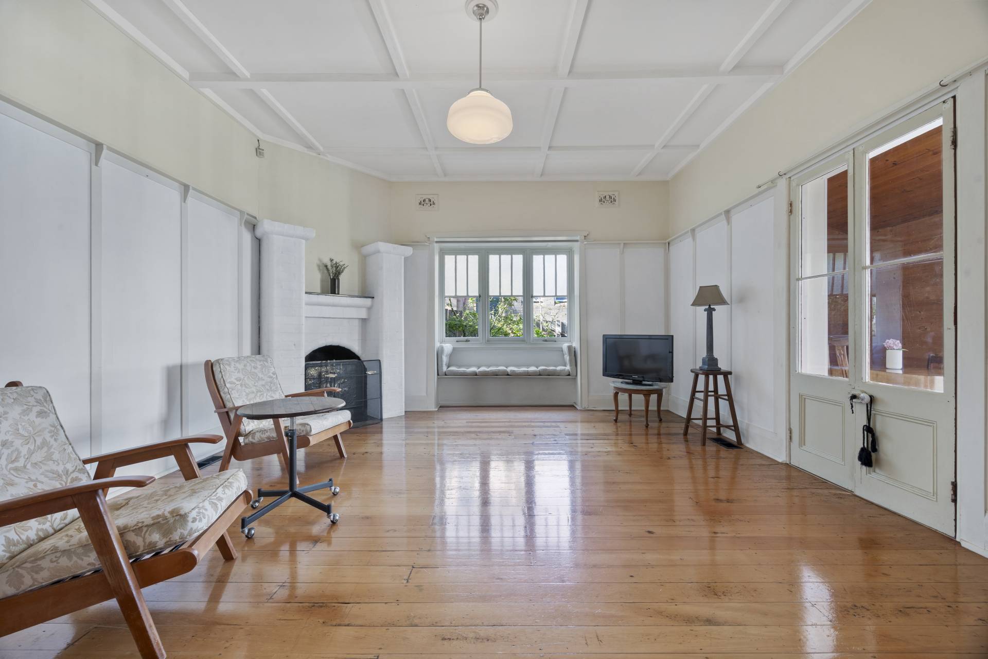 -    Huge formal lounge with open fireplace and bay window with built-in seating