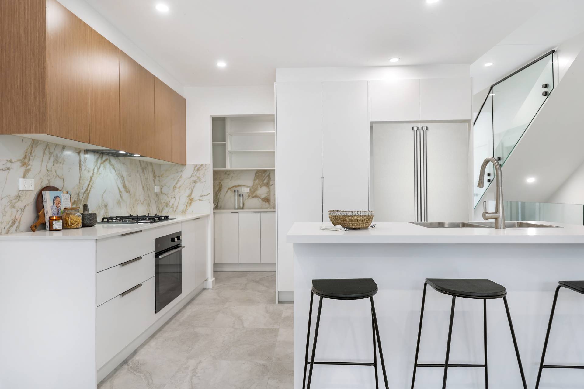 -    Chic island kitchen with walk-in pantry, gas cooking, dishwasher, quality joinery and stone benchtops