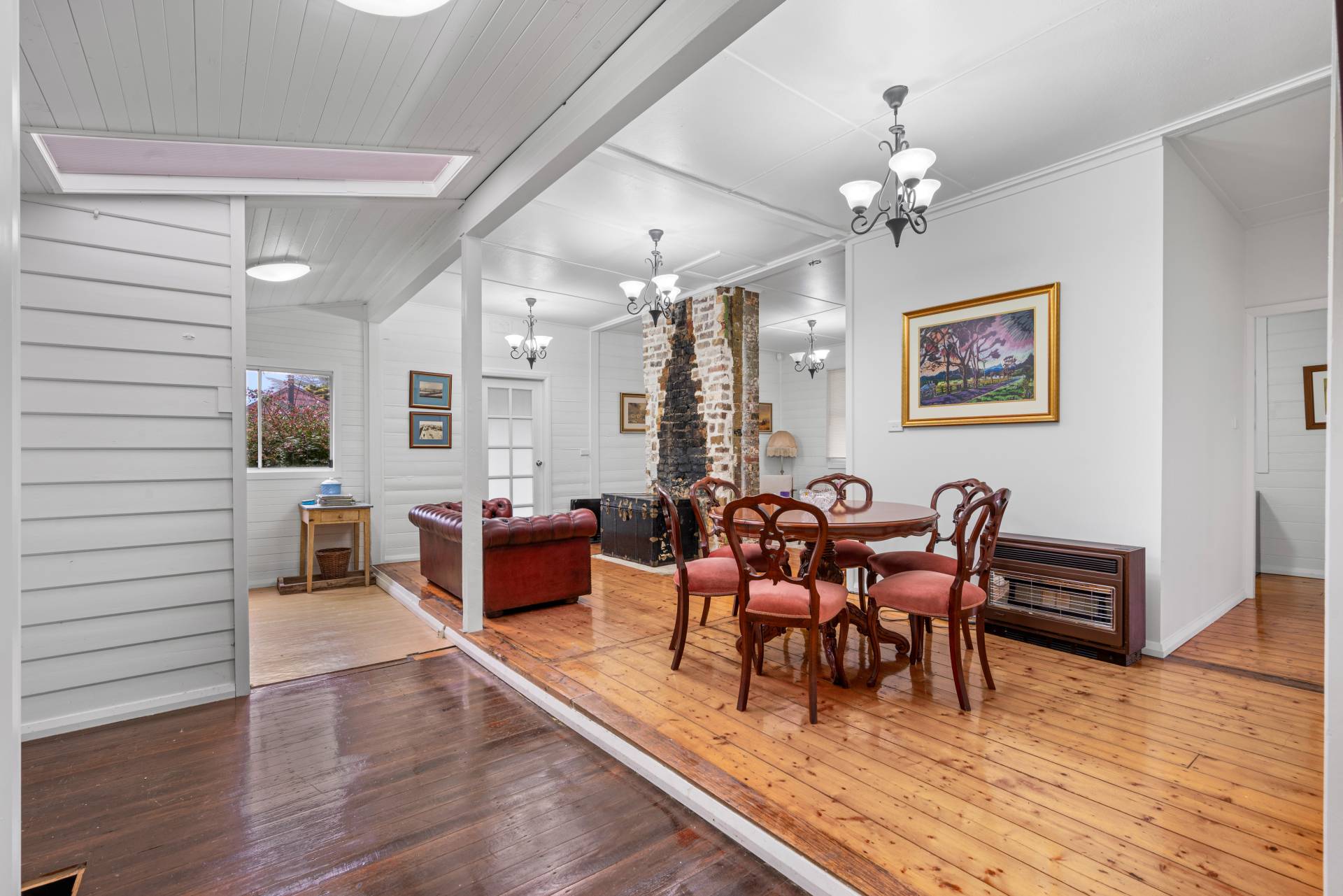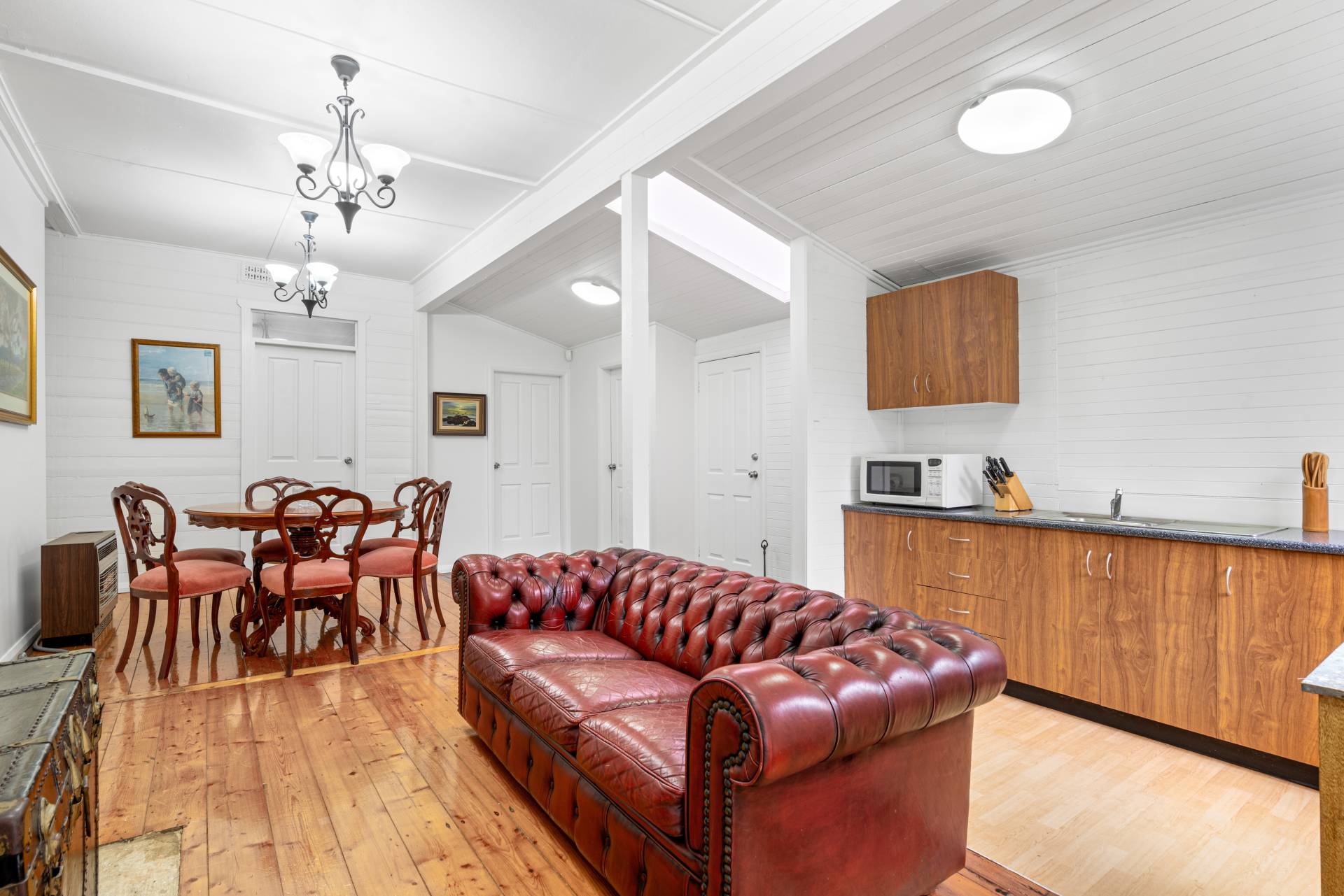 With high vaulted ceilings, skylight, stylish light fittings and timber floorboards throughout, the property blends the old with the new.  Sit on the front verandah and watch the world go by or cosy up in the lounge area, which offers gas heating (plus an additional bayonet).    Please note, the decorative fireplace has been decommissioned.