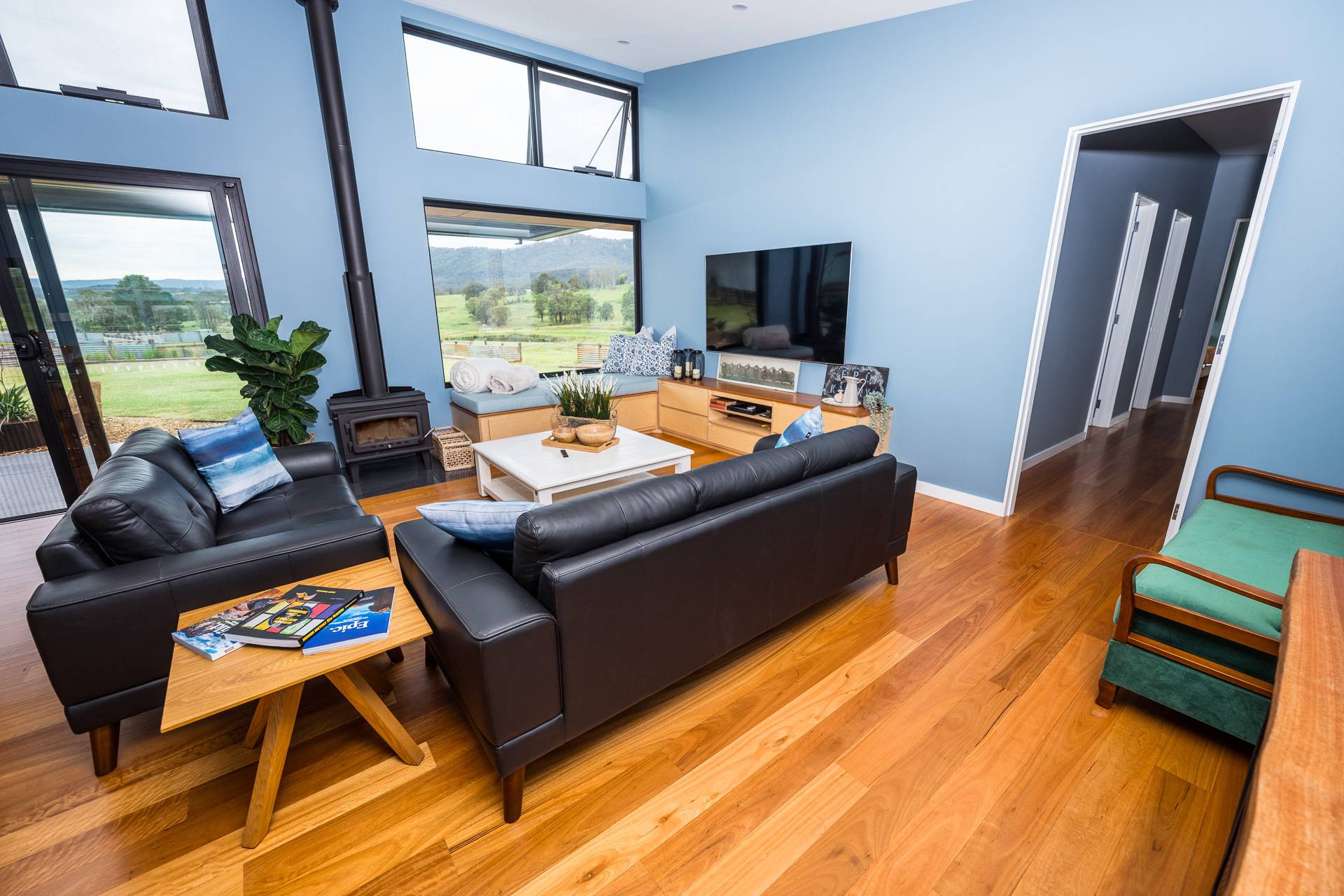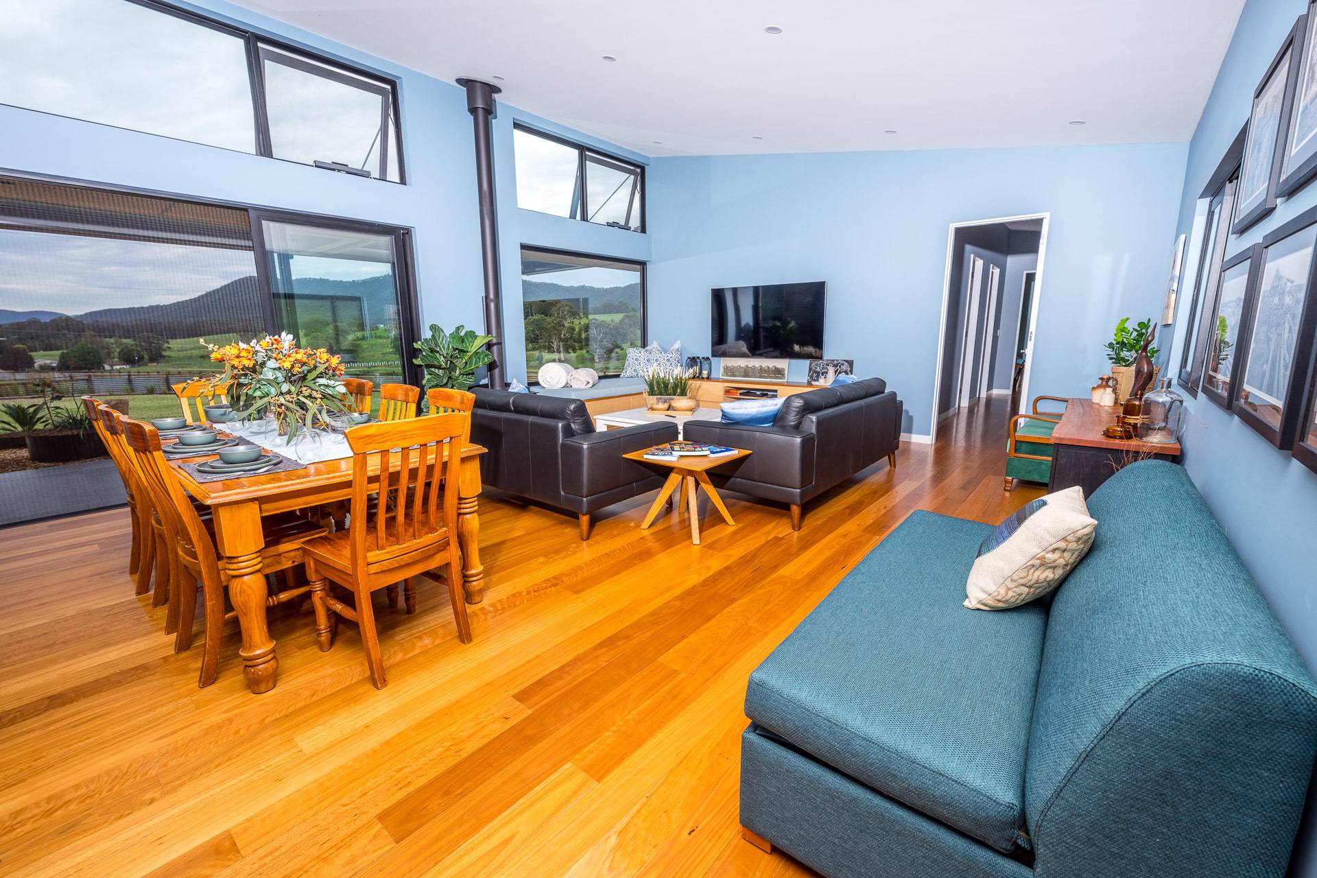 -    Spacious open plan living/dining, floor to ceiling glazing, electronically operated highlight windows, raked ceilings, slow combustion fire