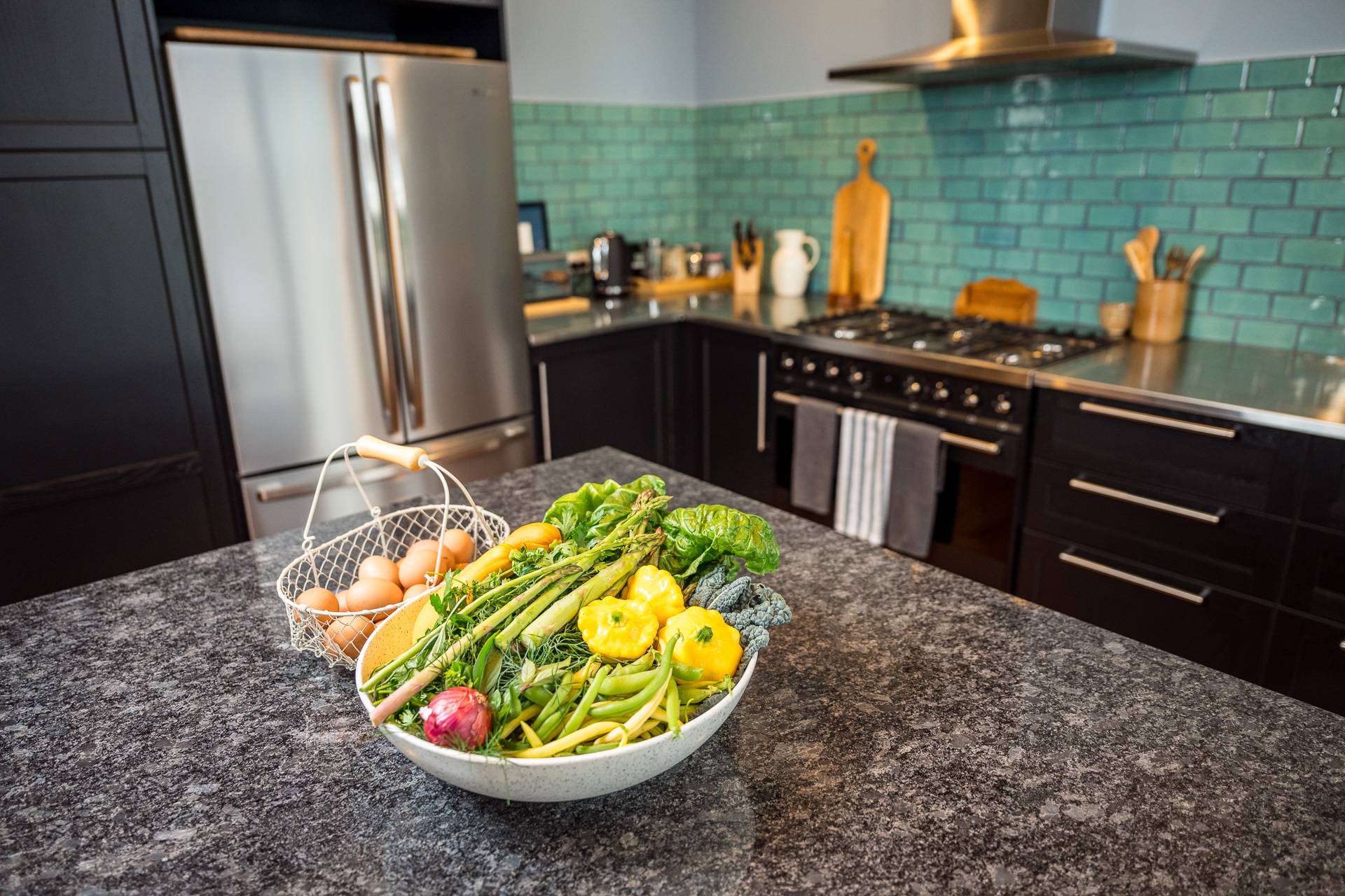 -    Huge island kitchen with 6 burner gas stove, dishwasher and combination of stainless steel and marble benchtops