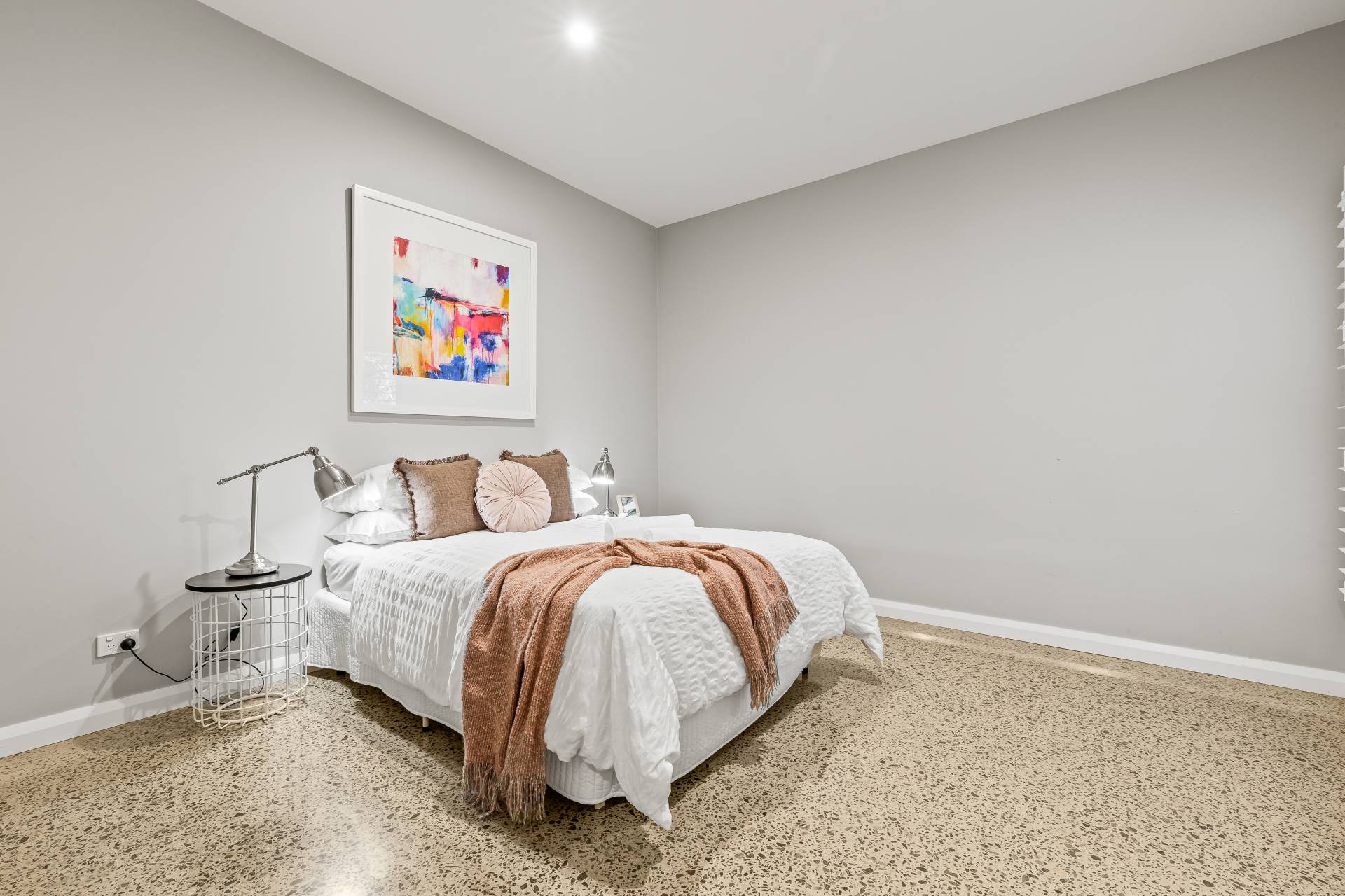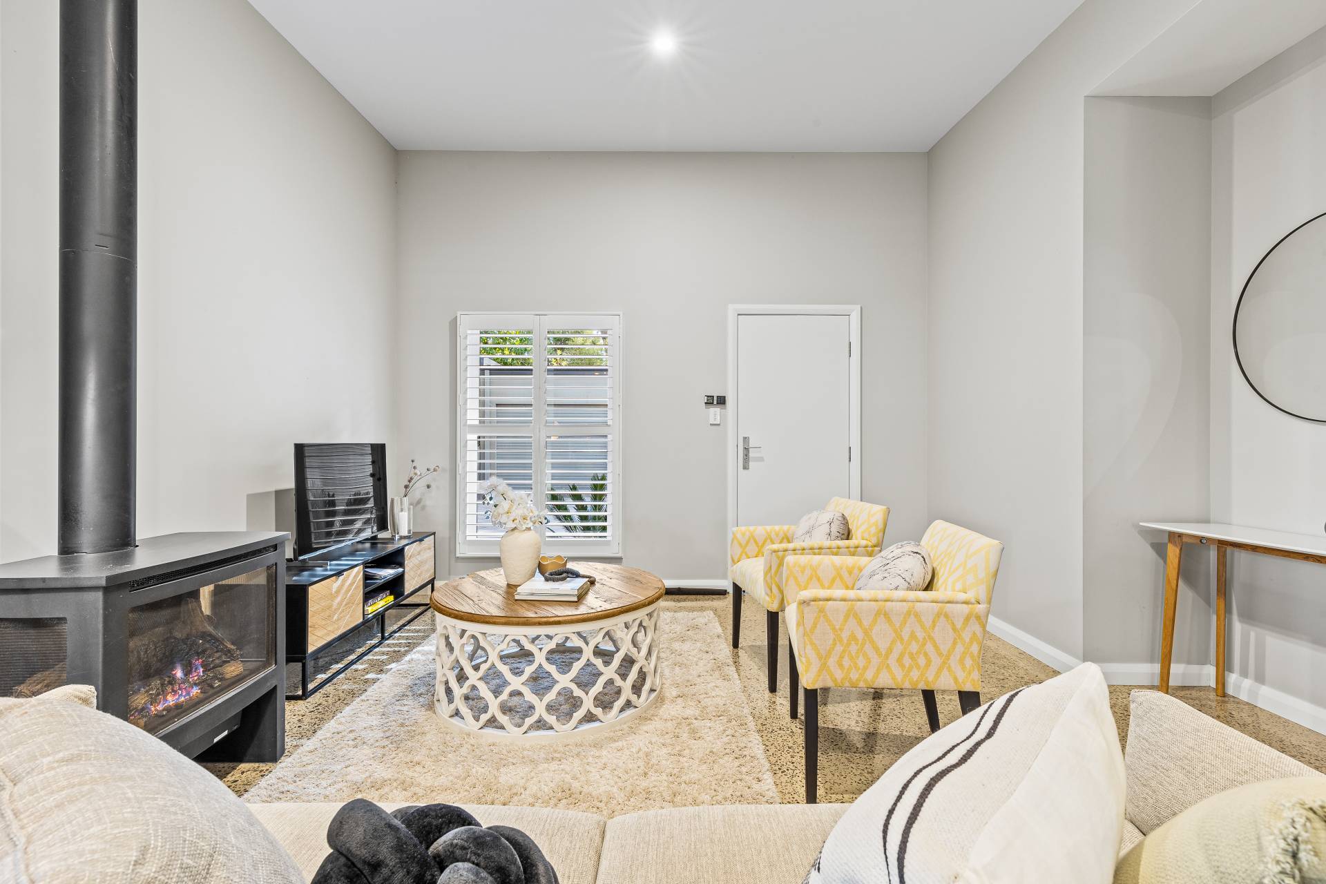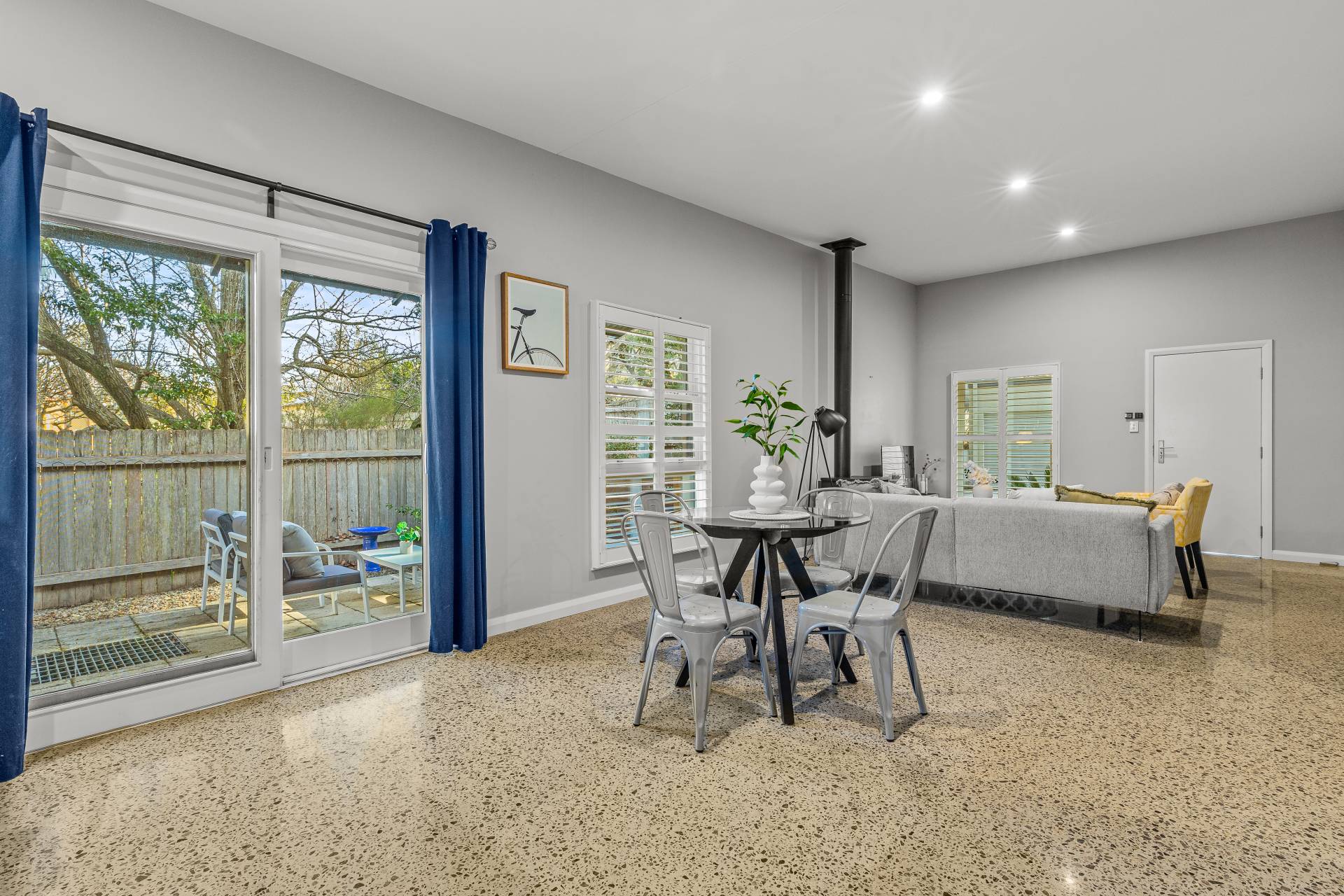 -    Spacious open plan living/dining with high ceilings, polished concrete flooring, gas LOPI fireplace and split system air conditioning