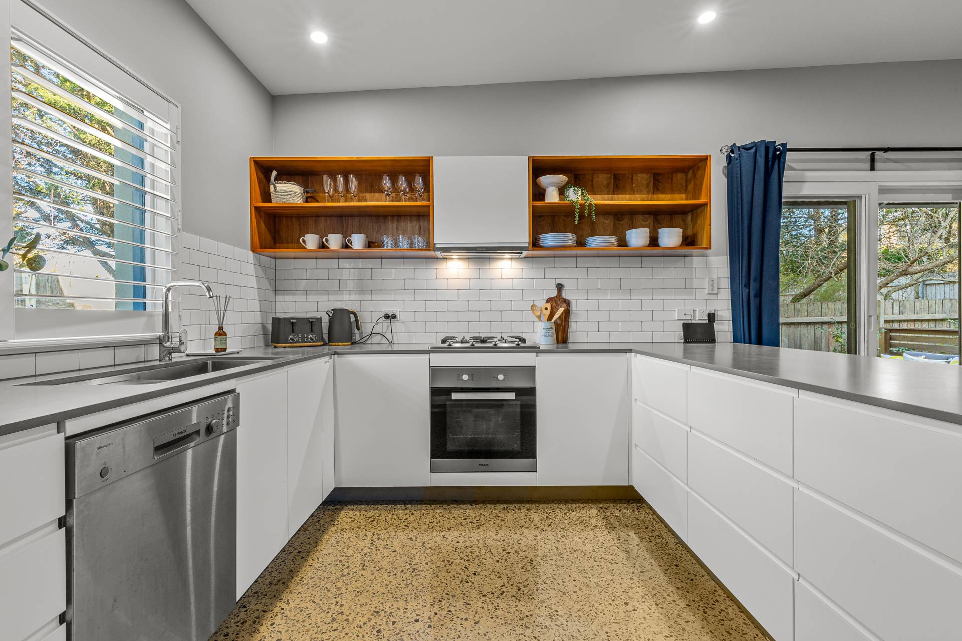 -    Large kitchen with stone benchtops, gas cooking and dishwasher