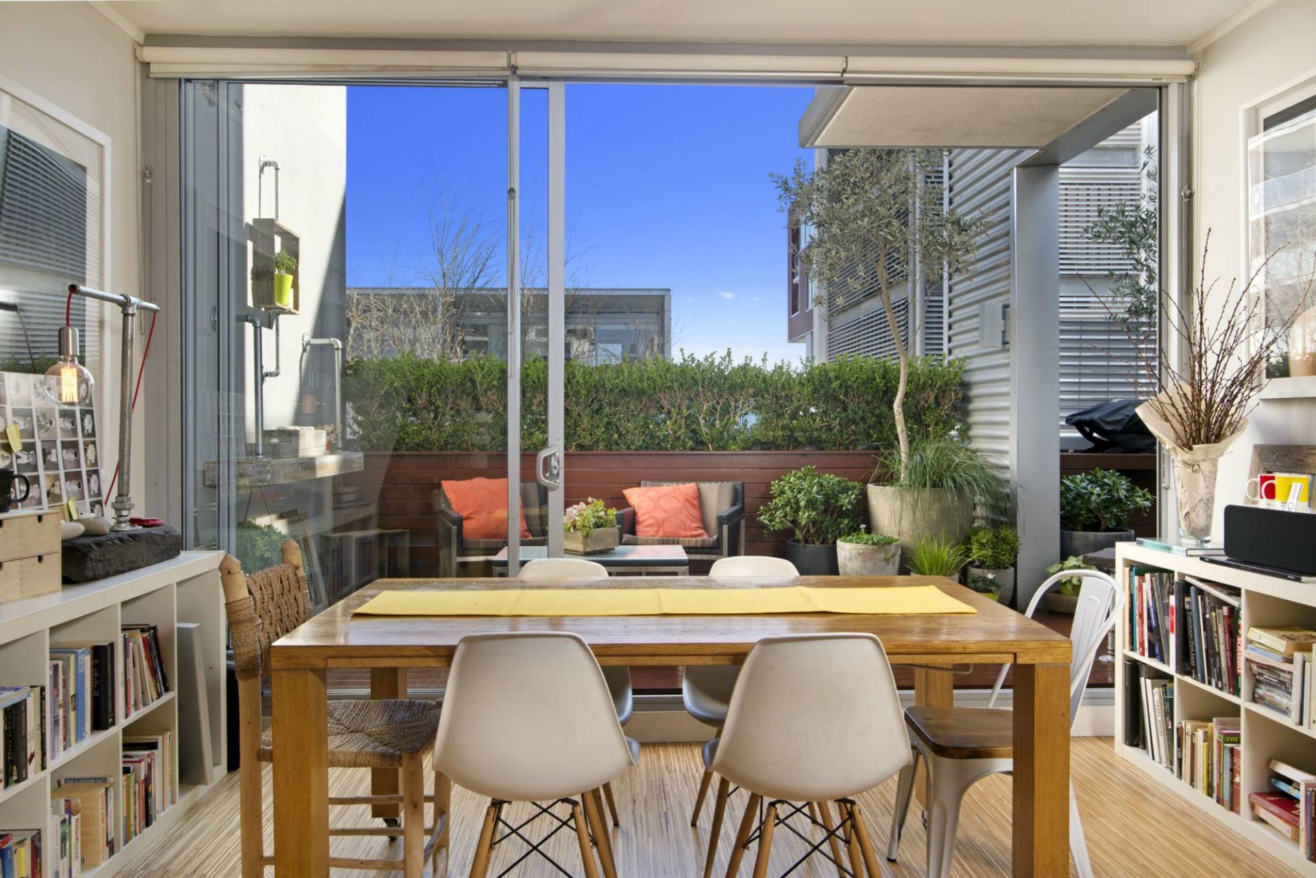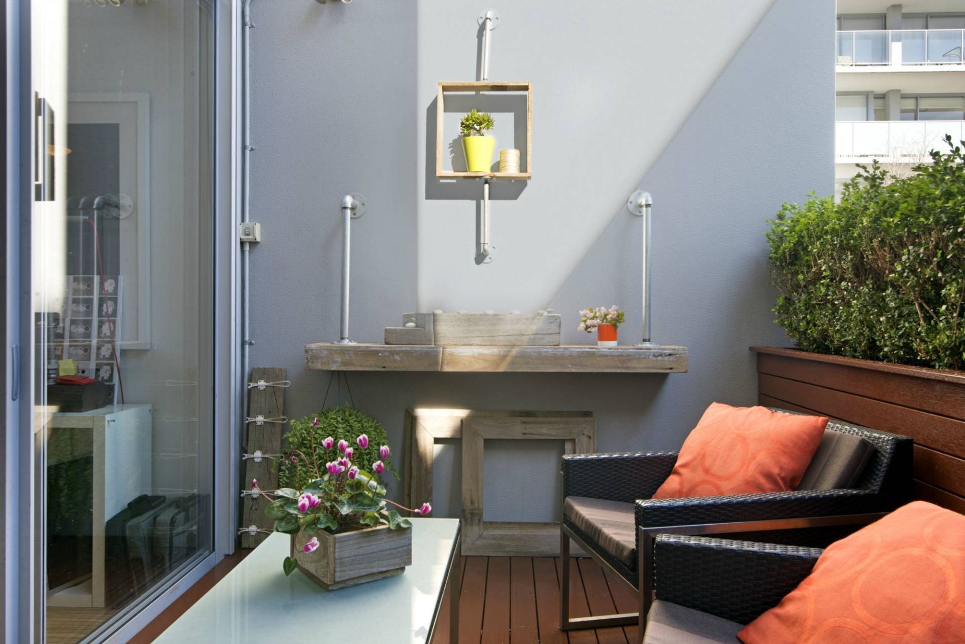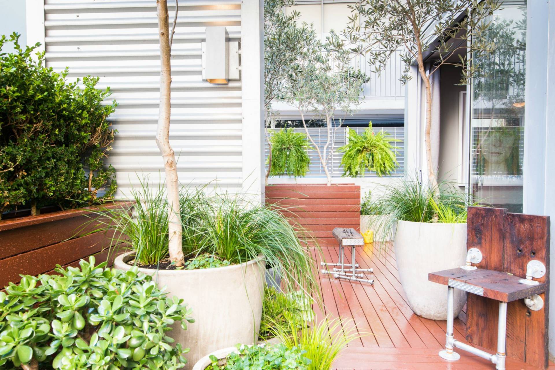 - Expansive entertaining terrace running the width of the apartment including an established garden incorporating hedges and custom planters with Olive trees
