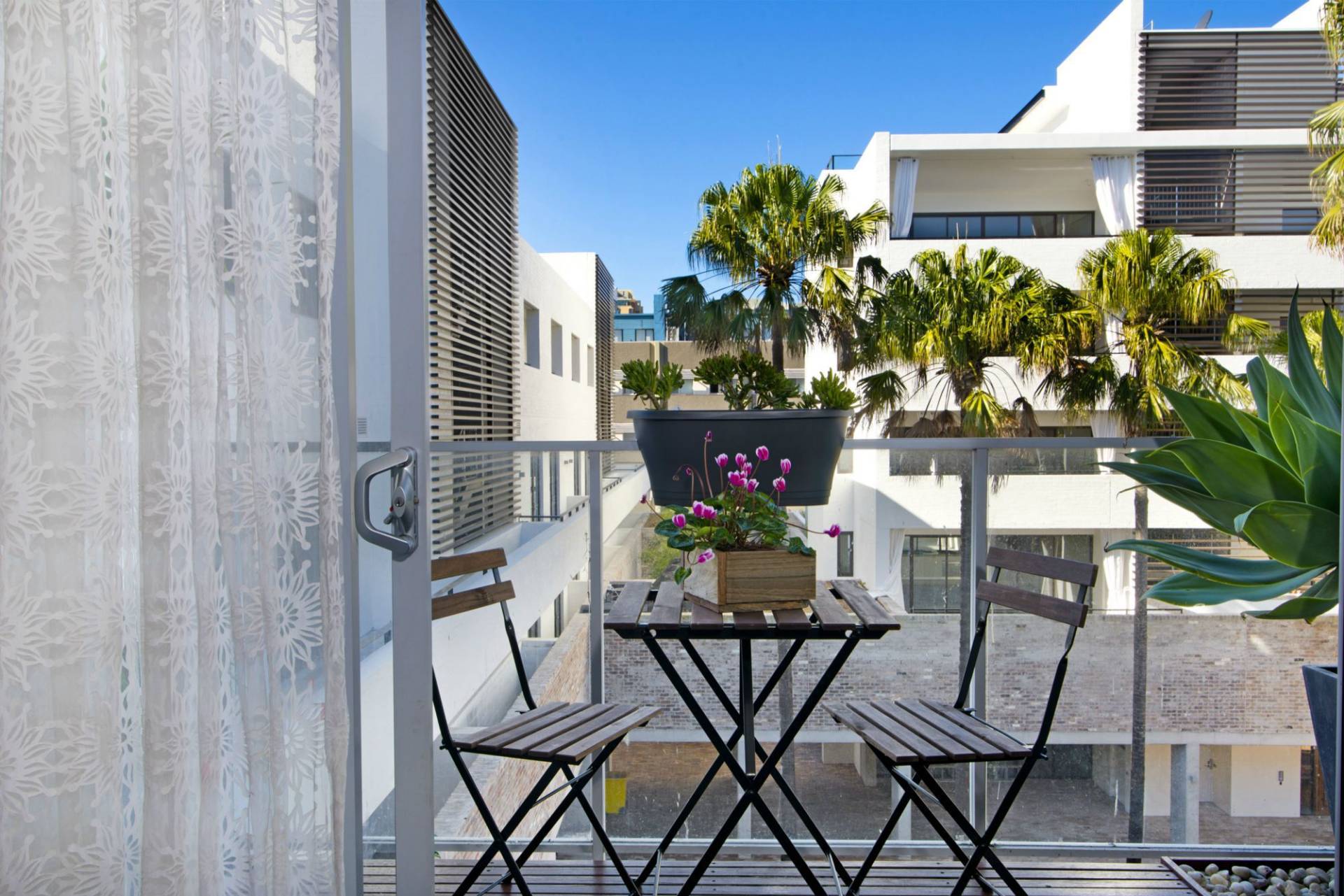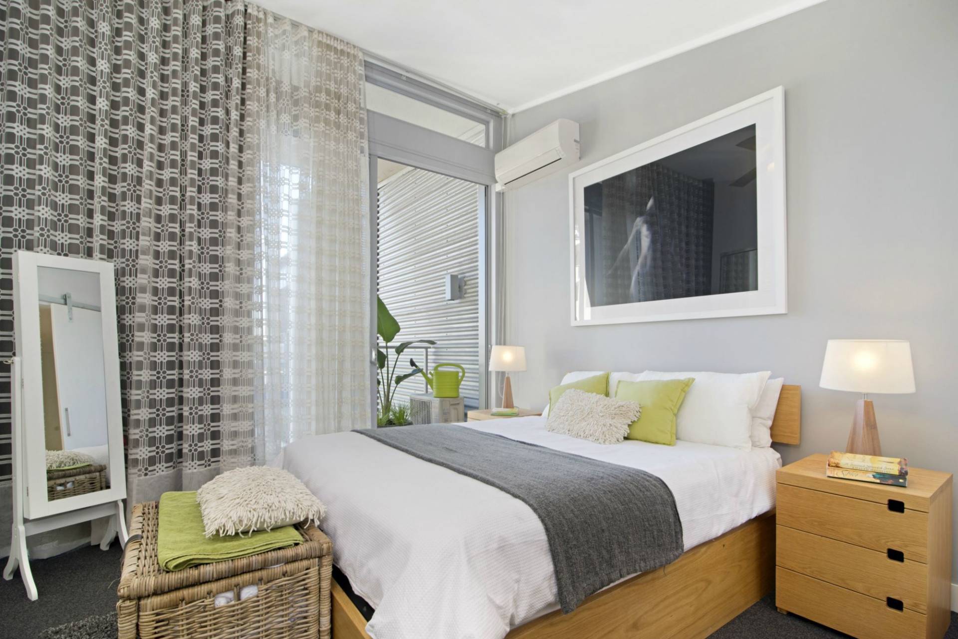 - Great sized master bedroom with soaring, skewed ceilings, built-in robes, ceiling fan, reverse cycle air conditioning, chic en-suite, double curtains and balcony overlooking the common gardens