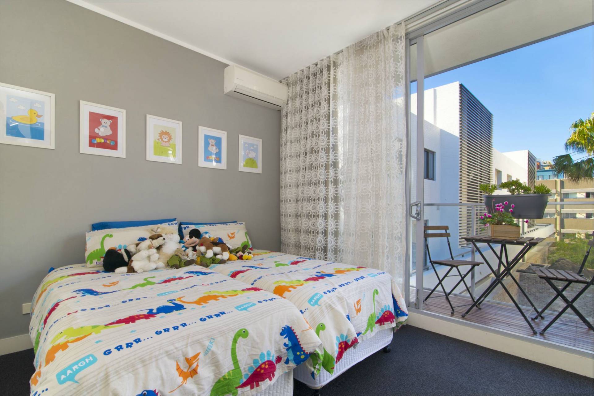 - Large second bedroom with built-in robes, ceiling fan, reverse cycle air conditioning, double curtains and balcony