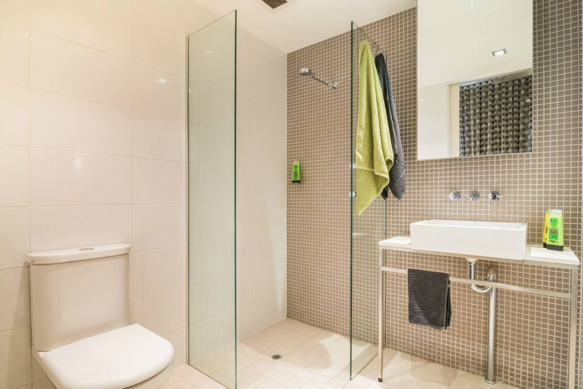 - Contemporary main bathroom with bath and extensive use of mosaic tiles