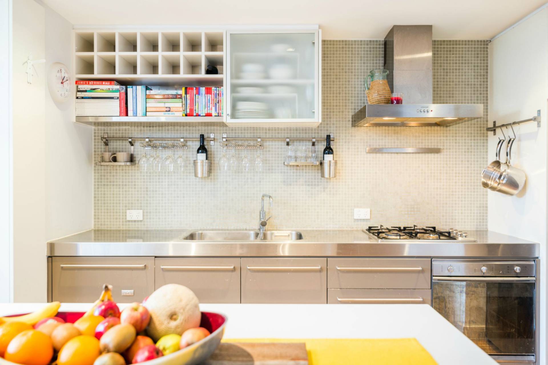 - Great sized, contemporary kitchen with loads of storage, polyurethane joinery, stainless steel benchtop, integrated wine rack and gas cooking