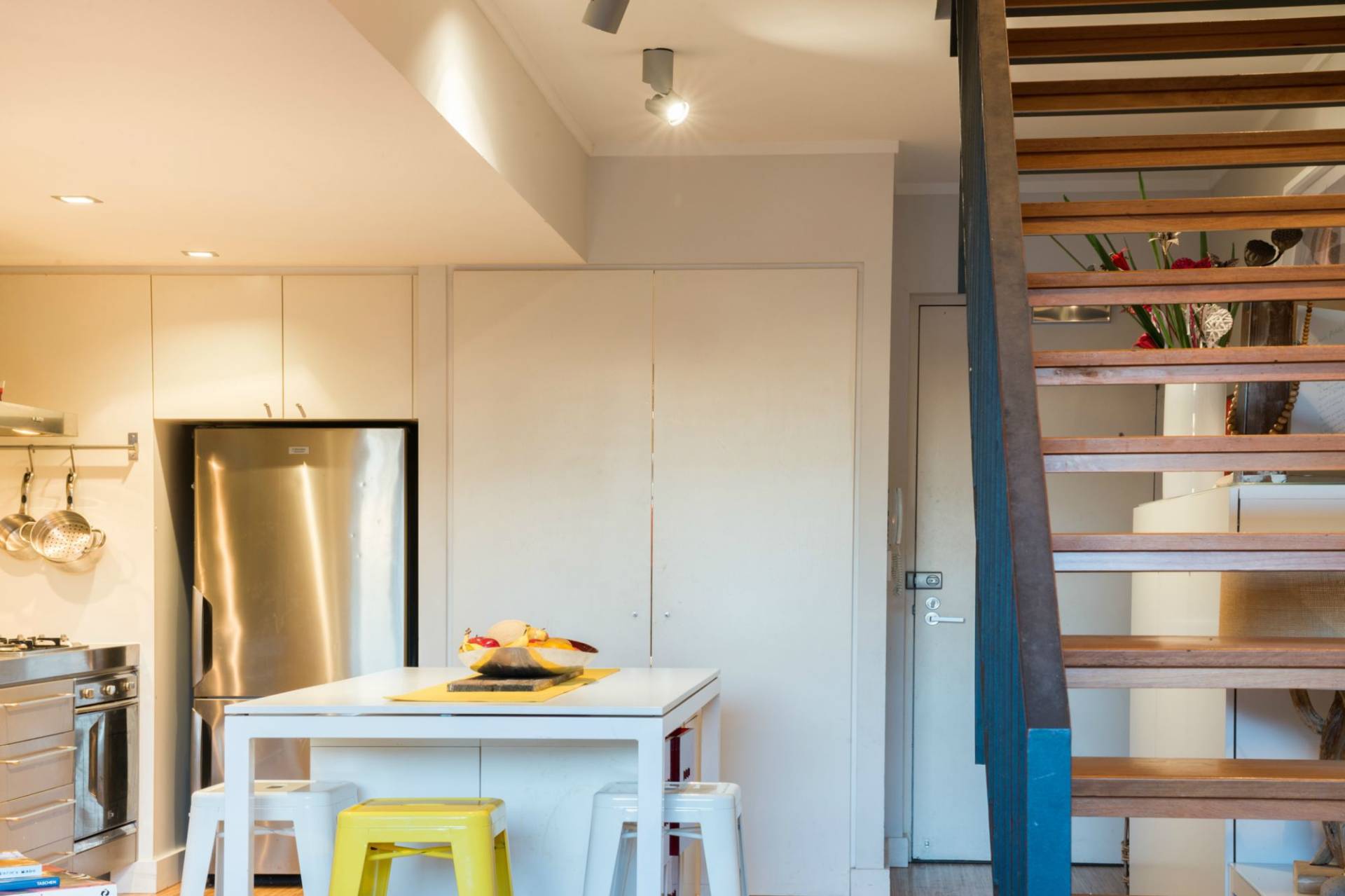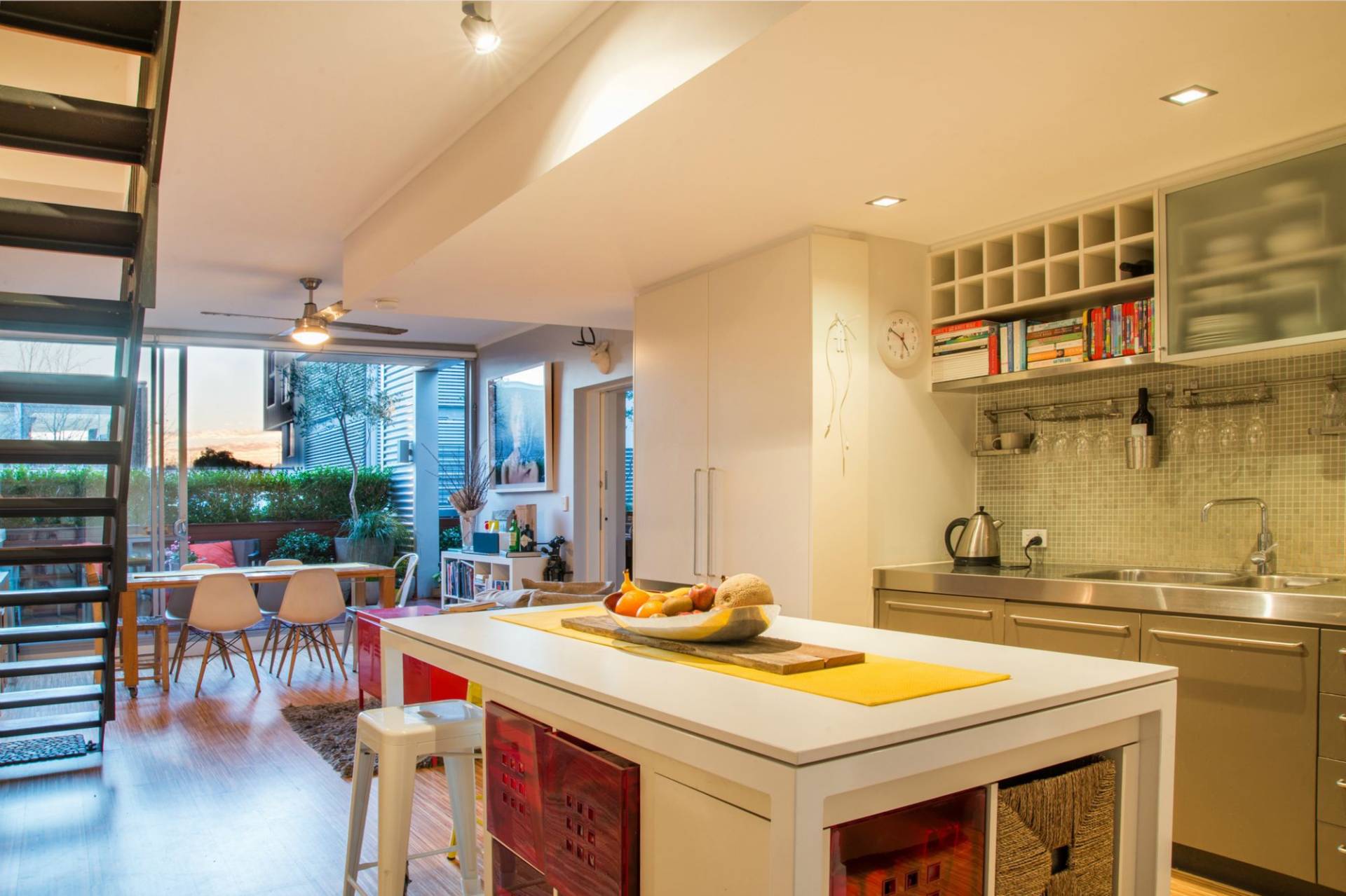 - Spacious open plan dining area with exposed timber/steel staircase, floor to ceiling glazing and clever under stairs storage