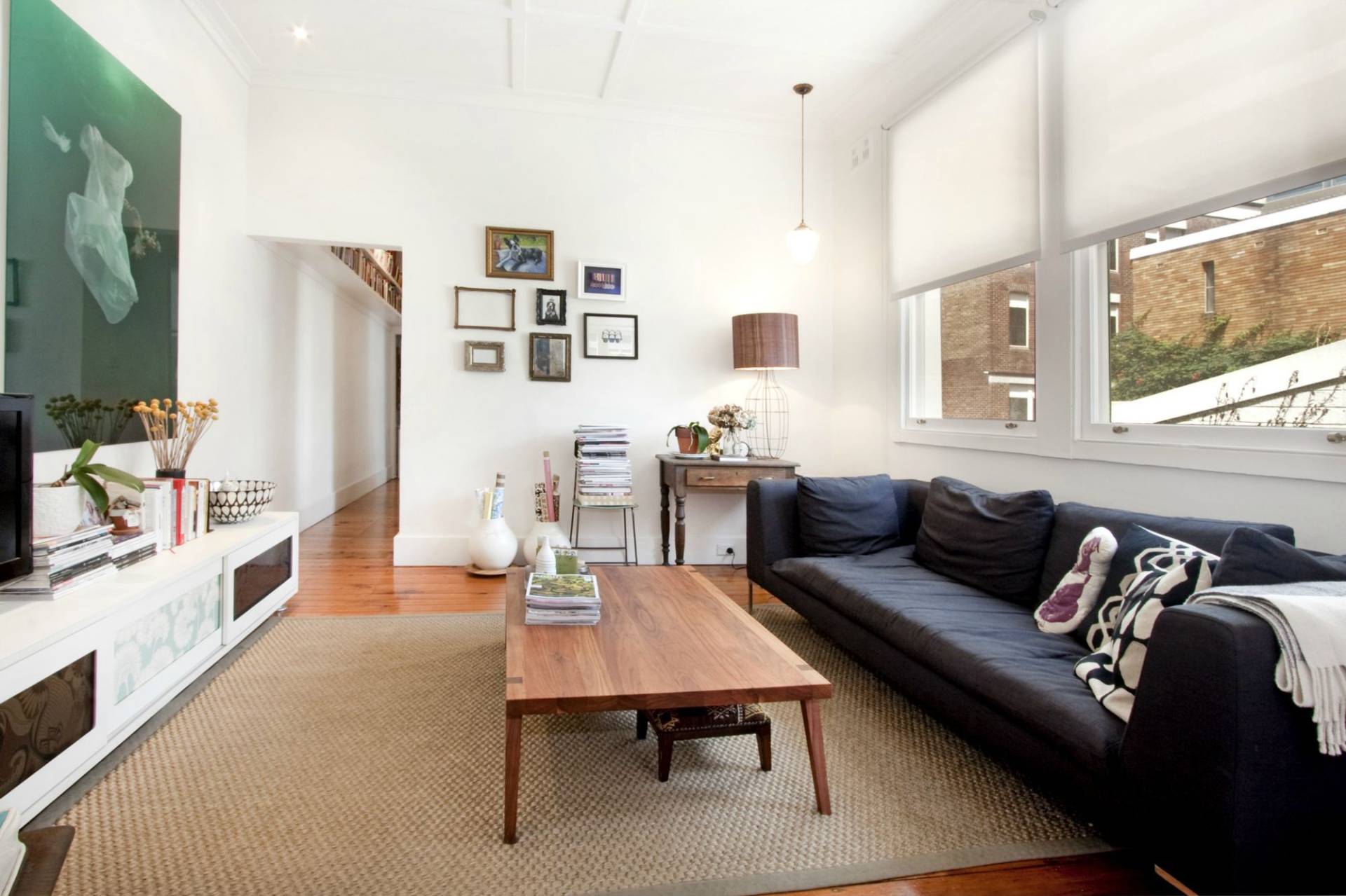 - Spacious living area with soaring ornate ceilings and timber floors