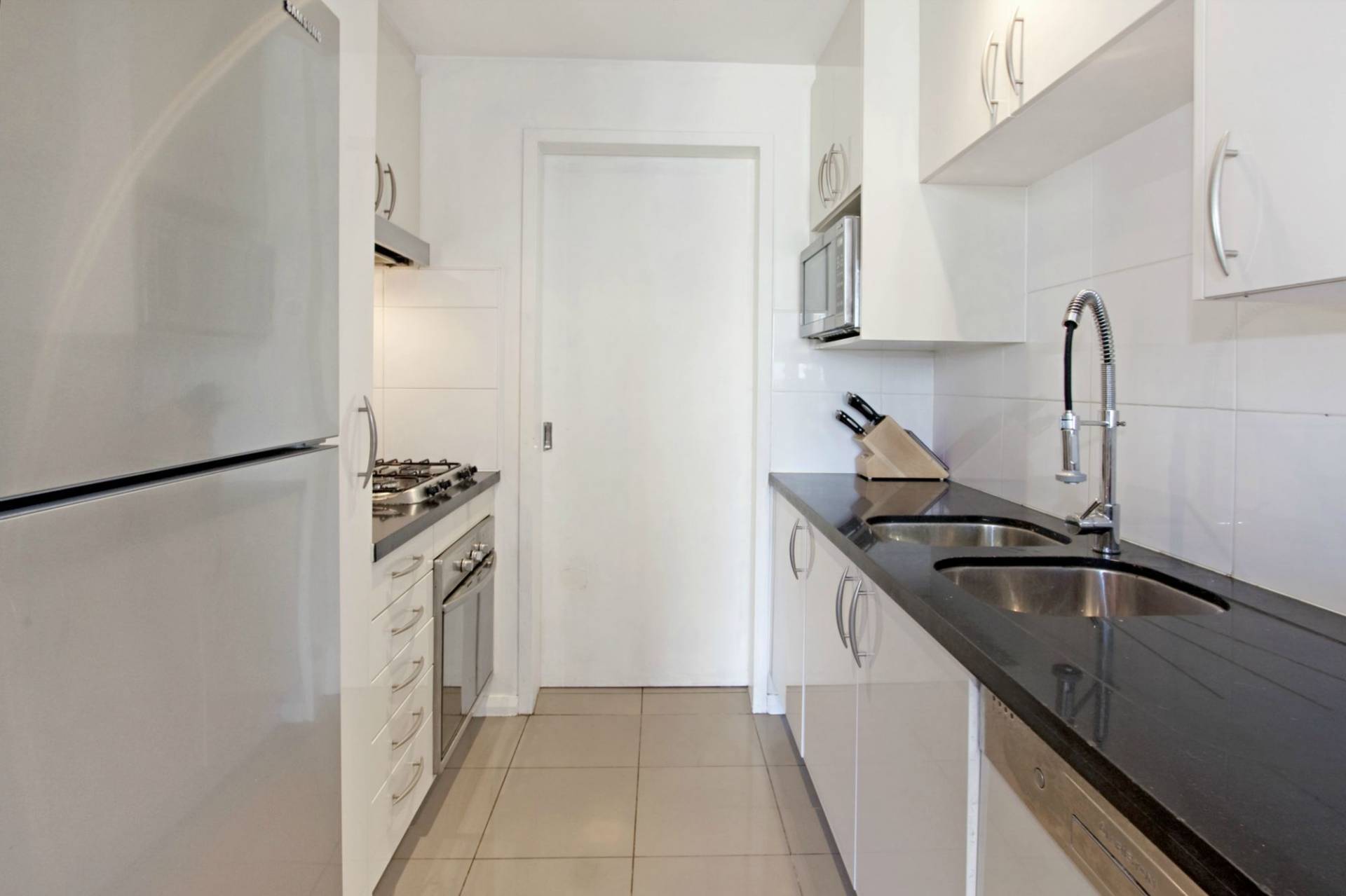 - Galley kitchen with 40mm stone benchtops, gas cooking & dishwasher