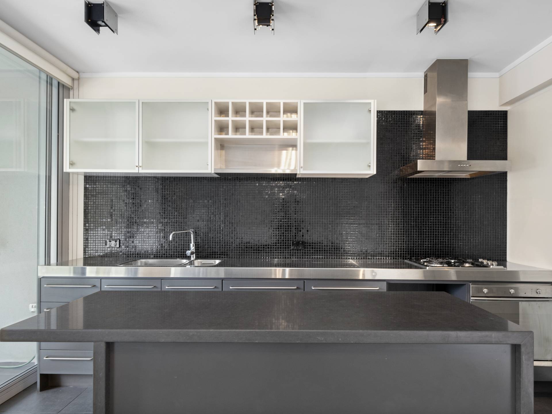 -          Sleek kitchen with custom island bench, gas cooking, integrated dishwasher and wine rack