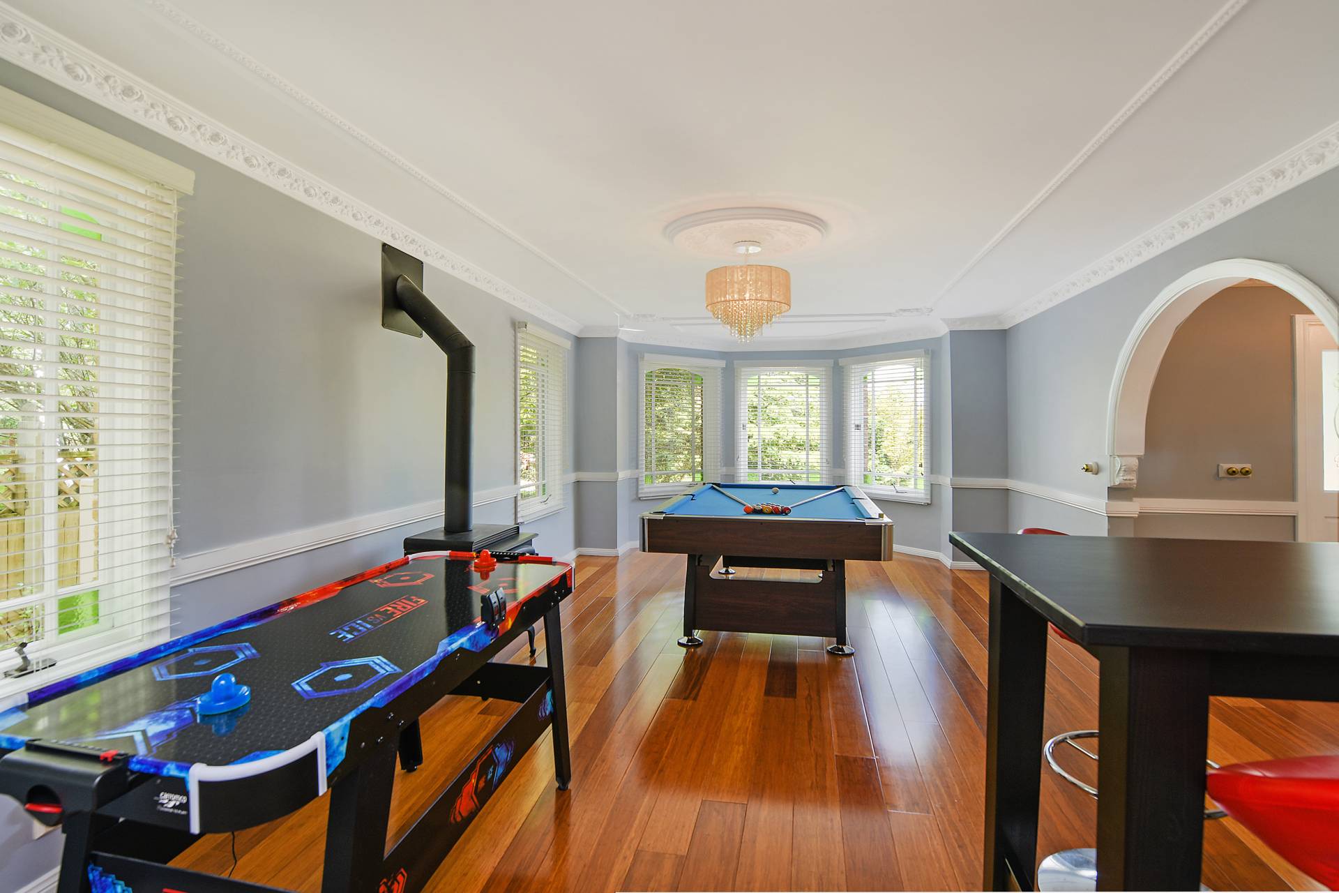 - Large formal living room (currently used as a games room) with gas fireplace and bay window